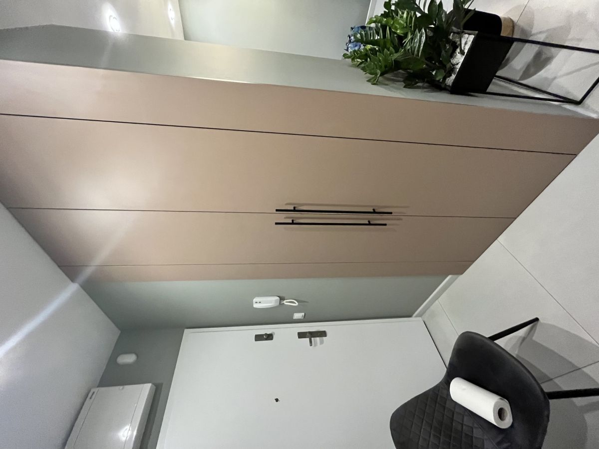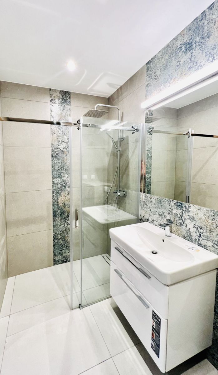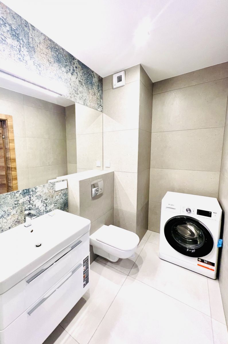- Łazienka z WC: prysznic walk-in, umywalka z szafką, lustro, pralka, szafki w zabudowie.