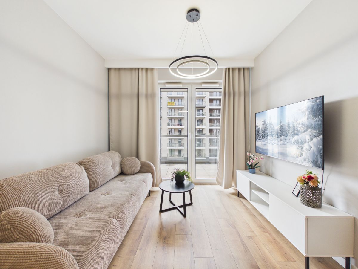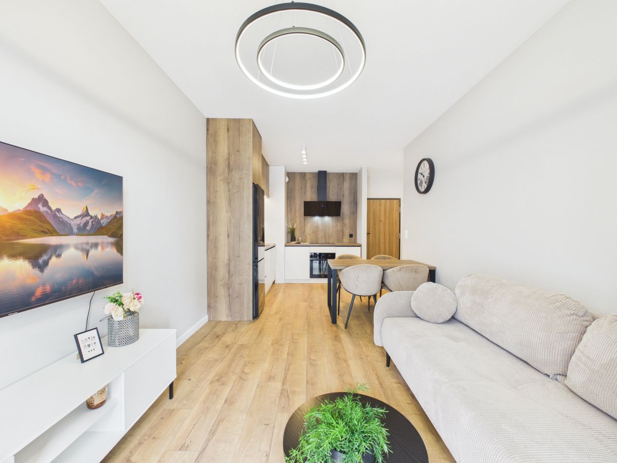 Pokój dzienny połączony z kuchnią i otwarty na przedpokój stanowi serce tego mieszkania. Ta część mieszkania podzielona została na dwie strefy - część wypoczynkową, w której znajduje się wygodna kanapa, stolik kawowy, telewizor oraz część kuchenną, wyposażoną we wszystkie niezbędne w nowoczesnej kuchni sprzęty.