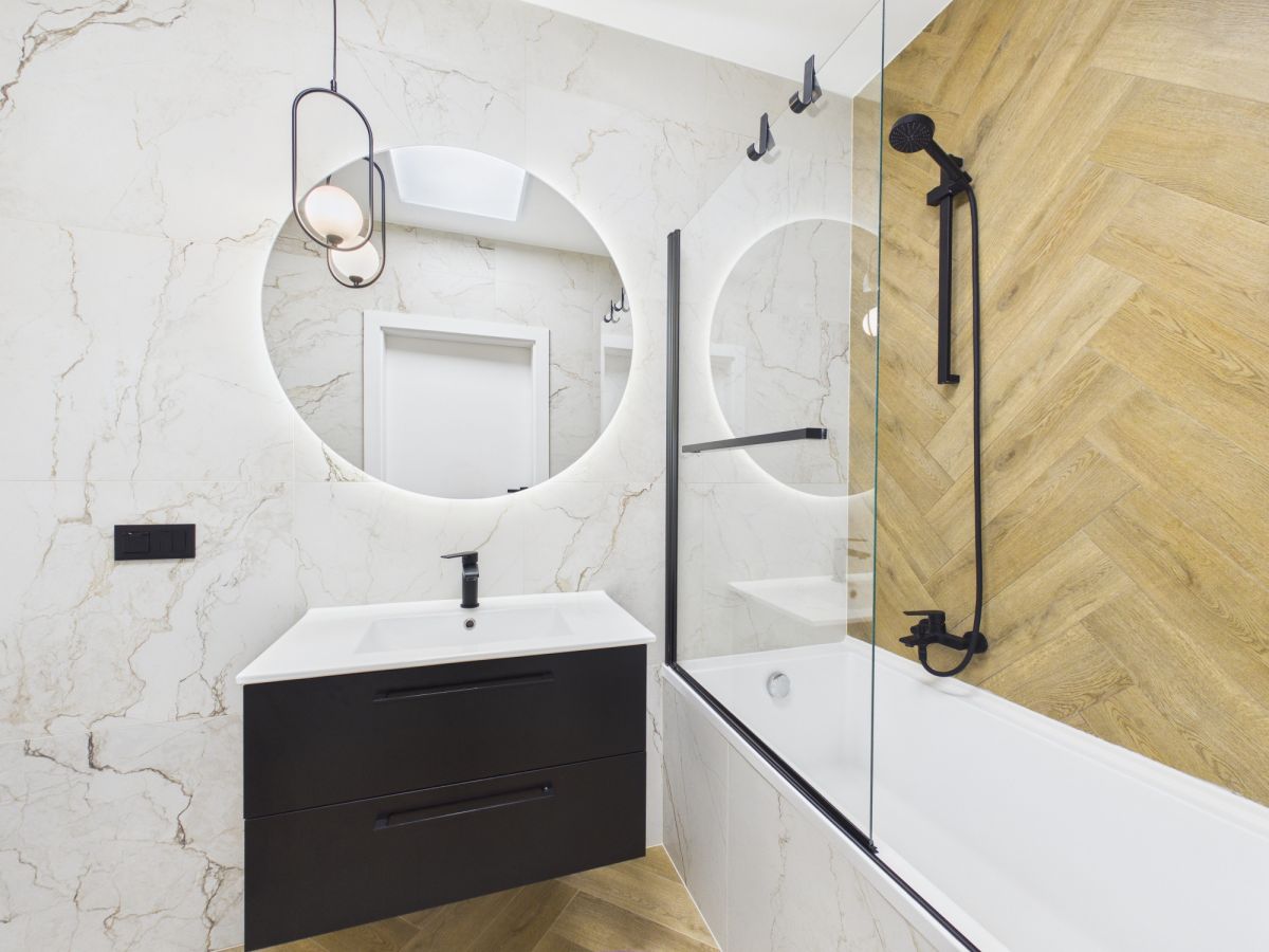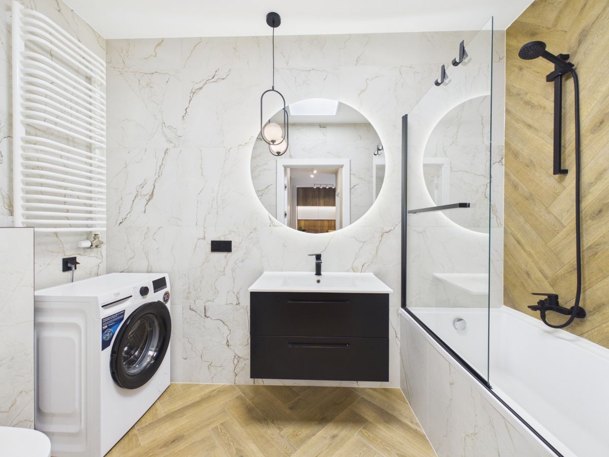 W łazience do dyspozycji najemcy znajduje się wanna z parawanem, umywalka z szafką, lustro, toaleta oraz pralka.