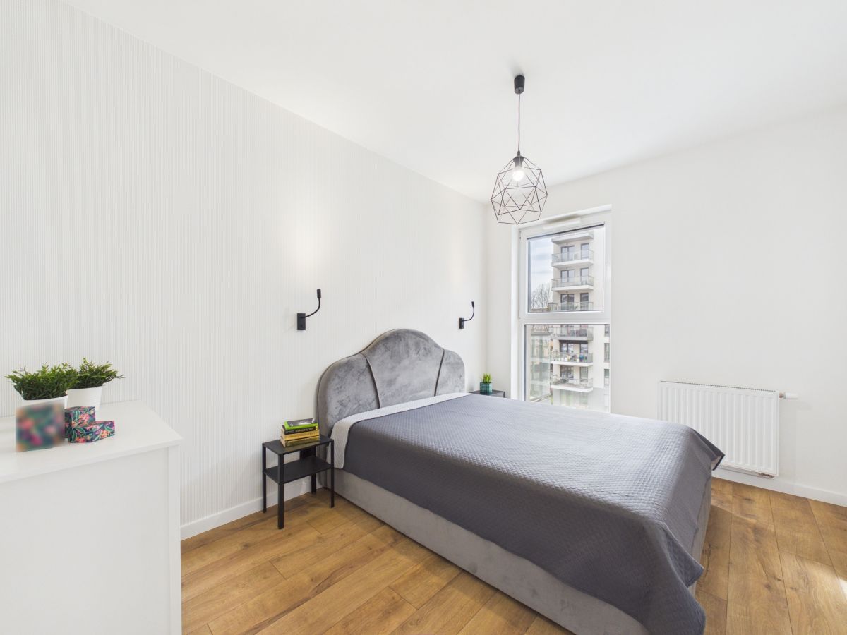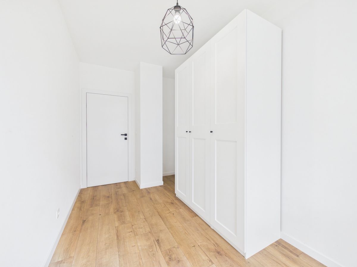 Dodatkowa sypialnia wyposażona jest w pojemną szafę. Ten pokój może zostać zaadaptowany na pokój dla dziecka, pokój gościnny lub miejsce do pracy zdalnej.