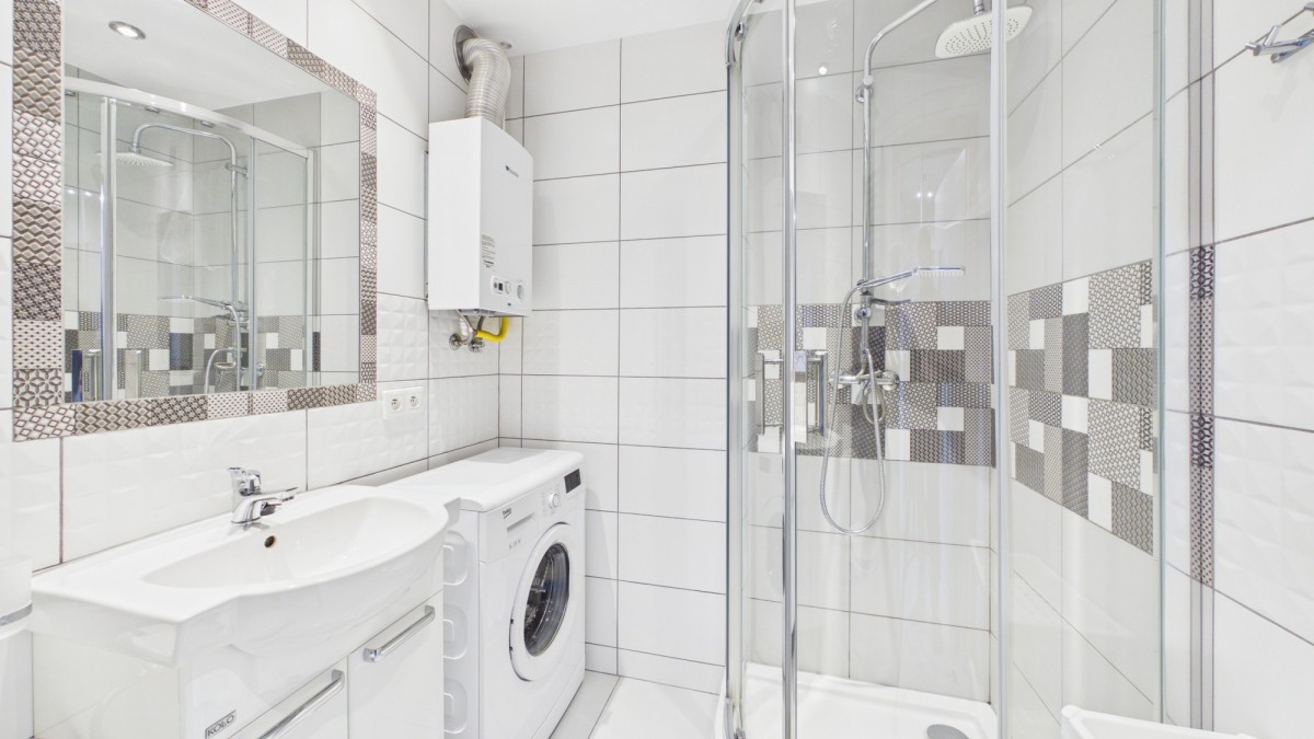 Łazienka: Kabina prysznicowa, estetyczna szafka z umywalką, toaleta, lustro.