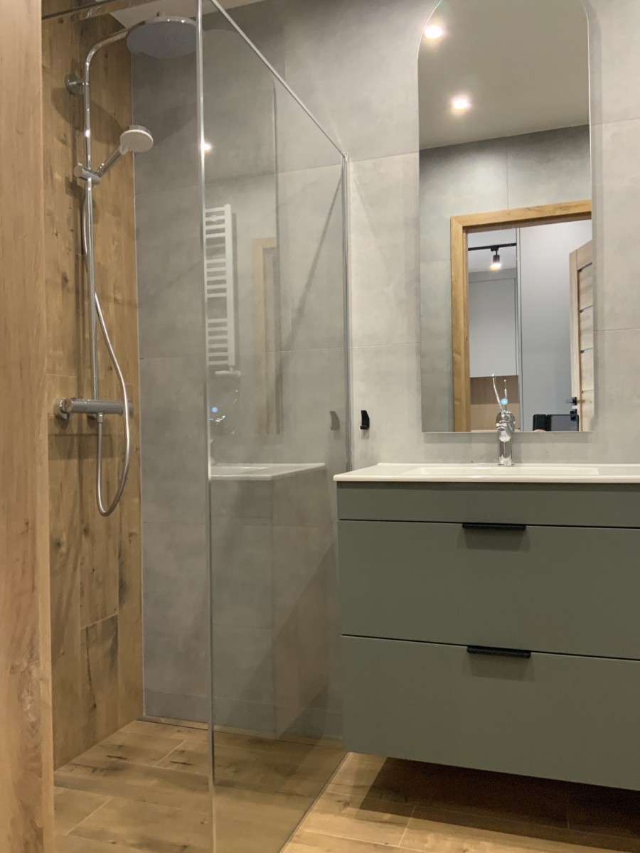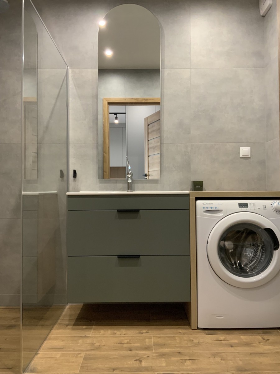 Łazienka: z pralką i prysznicem typu walk-in.