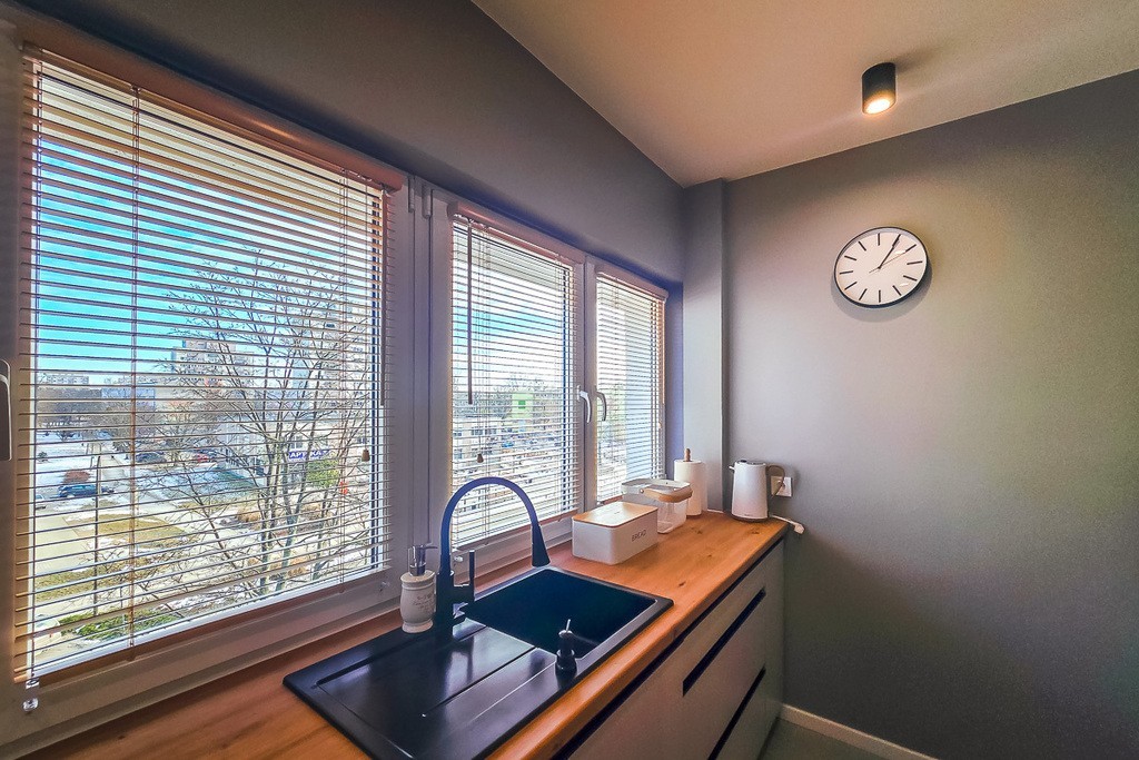To rozkładowe mieszkanie o powierzchni 45,13 m² jest w idealnym stanie po generalnym remoncie. Składa się z dwóch umeblowanych pokoi (salonu z balkonem i sypialni), oddzielnej kuchni z pełnym wyposażeniem (nowe meble w zabudowie, lodówka z zamrażarką, zmywarka, piekarnik, płyta indukcyjna, okap, czajnik, zlewozmywak), łazienki z WC (prysznic, pralka, umywalka) oraz przestronnego przedpokoju z dużą pojemną szafą. Okna PCV wychodzą na wschód i zachód, co zapewnia dobre doświetlenie i przyjemną atmosferę. Mieszkanie ma podłogi z paneli i terakoty, a drzwi wejściowe są antywłamaniowe.