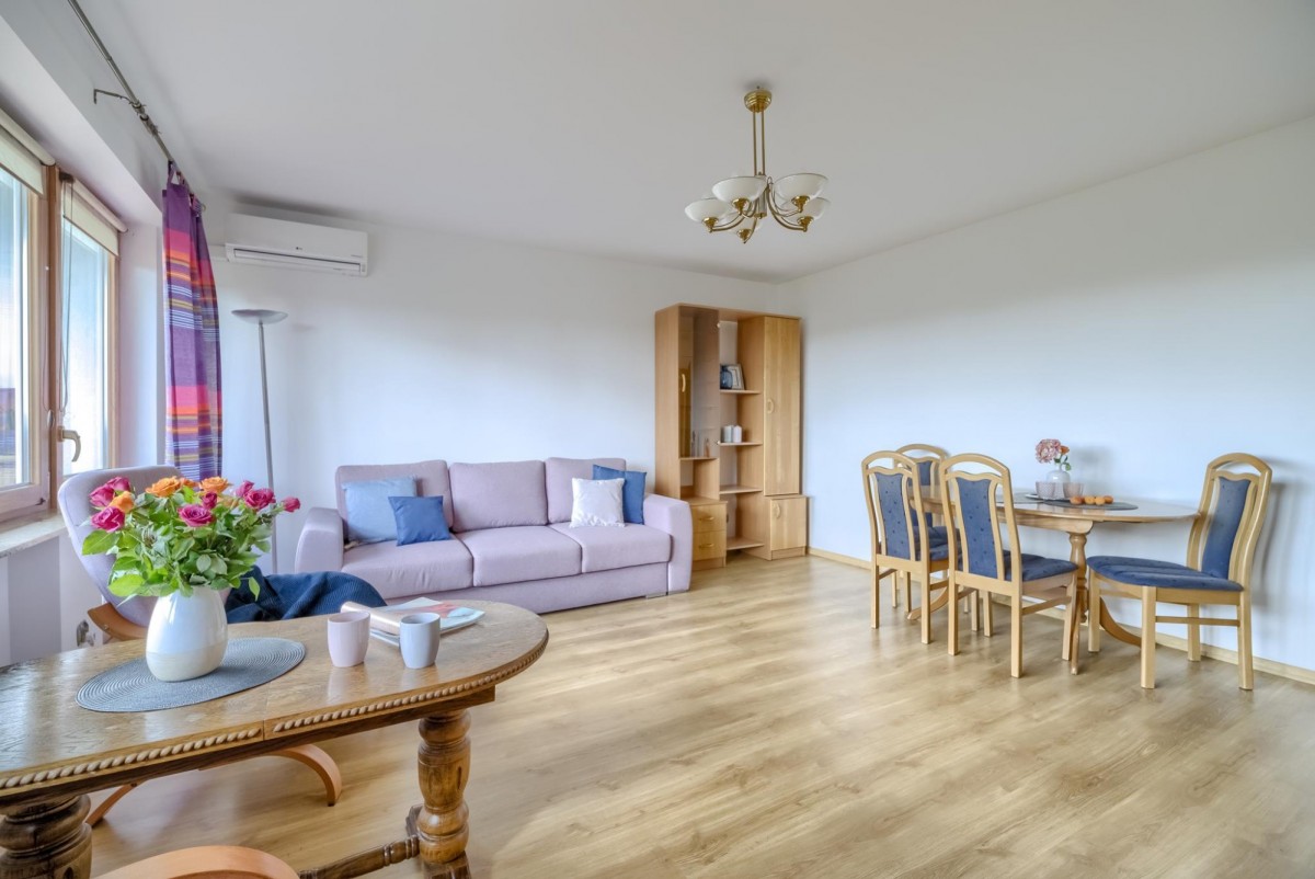 Przestronne mieszkanie z klimatyzacją. Wysokie piętro zapewnia super widoki i dużo światła dziennego.