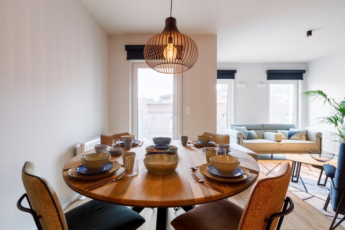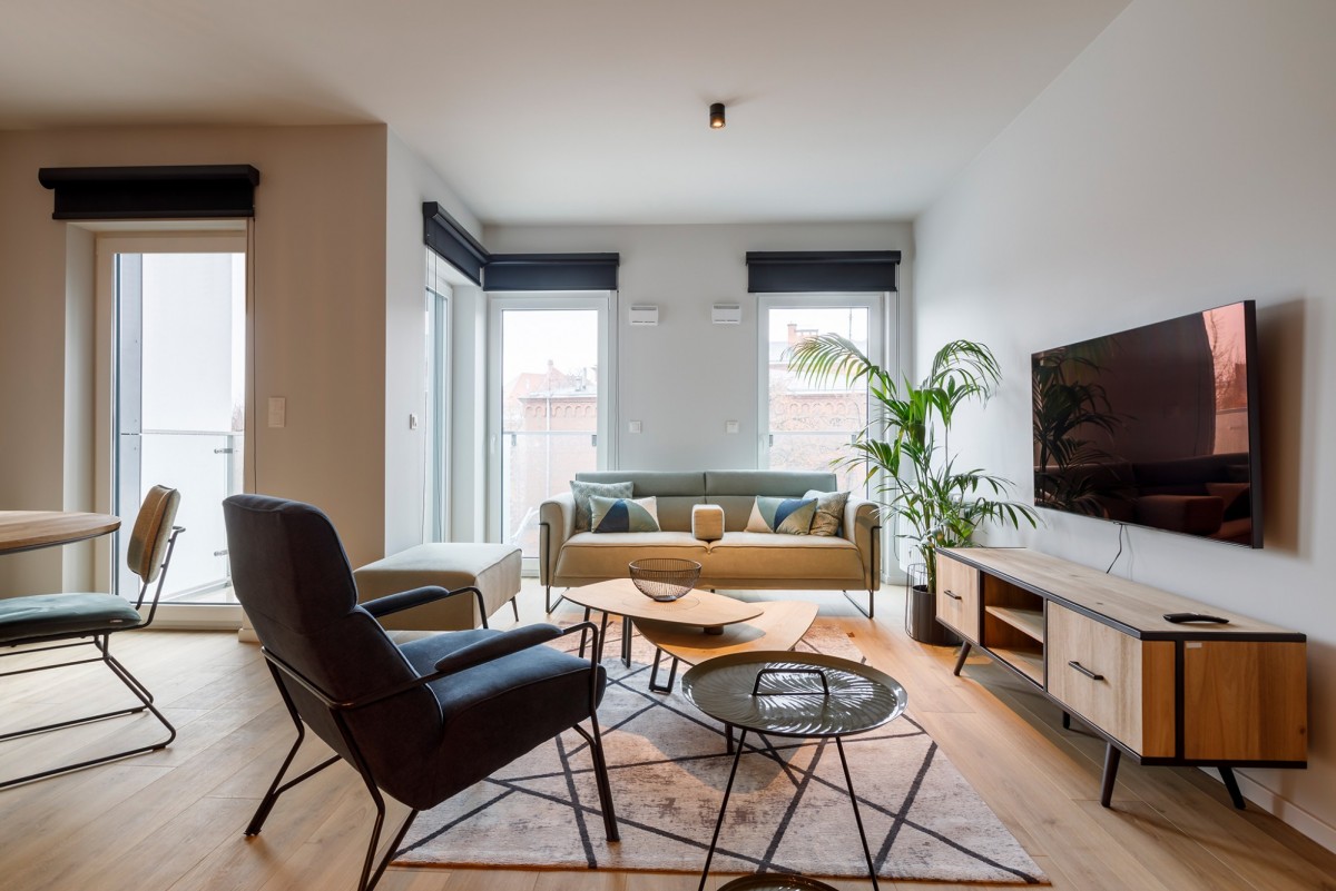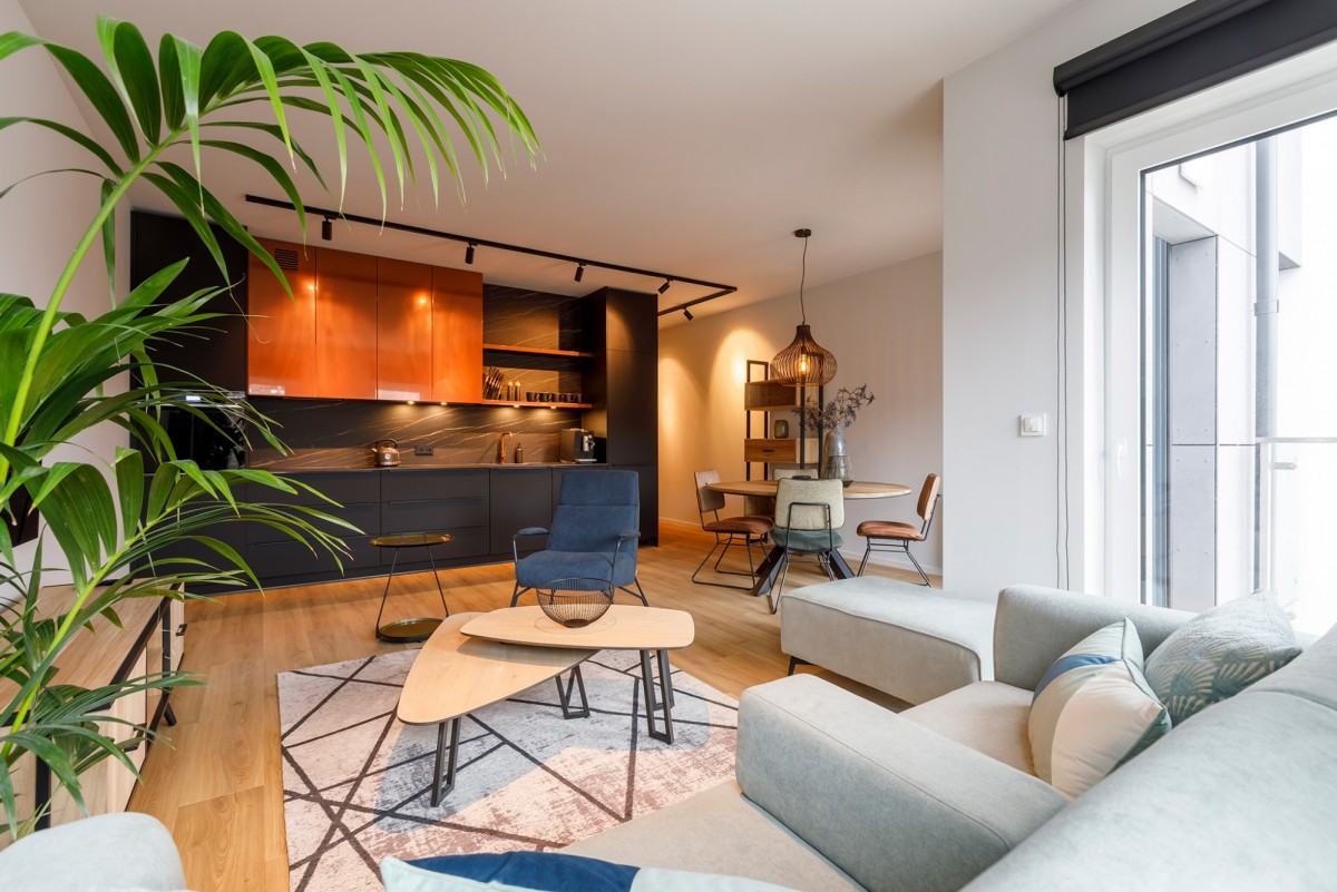 Mieszkanie jest przestronne, dobrze doświetlone i wyposażone w klimatyzację, co zapewnia komfort przez cały rok. Lokal jest w pełni umeblowany, urządzony w nowoczesnym stylu - wszystkie meble widoczne na zdjęciach pozostają do dyspozycji najemcy.