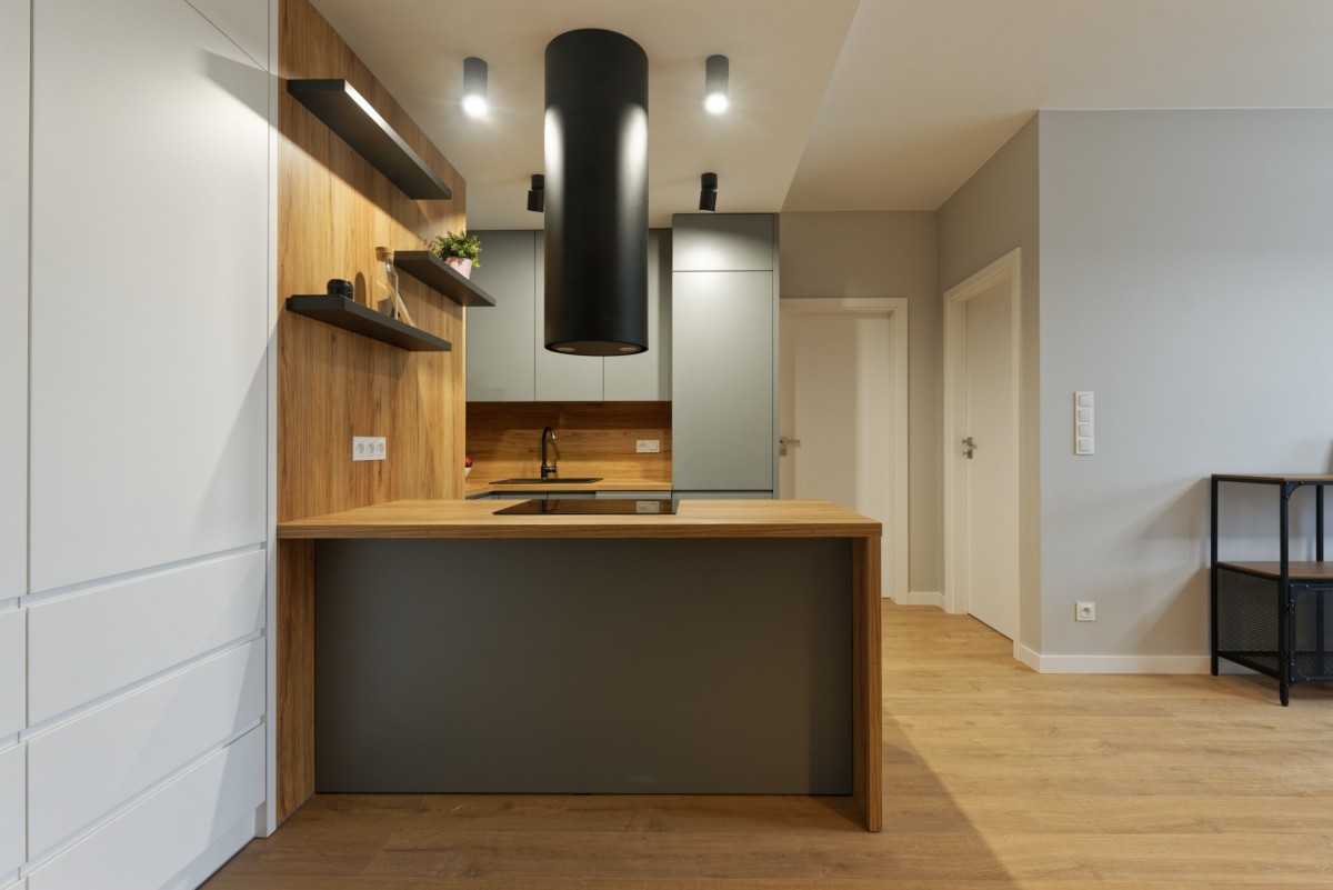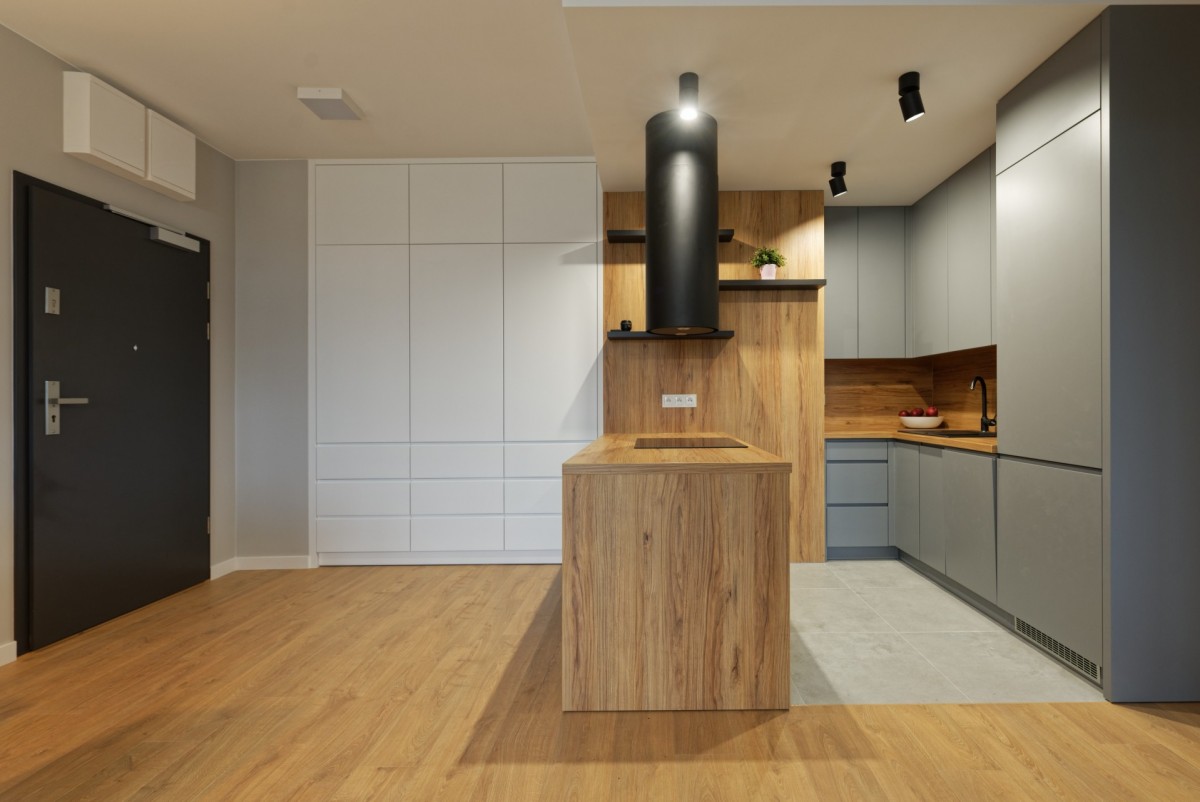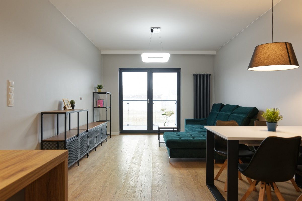 - umeblowany salon (kanapa z funkcją spania, stolik kawowy, stół +krzesła, szafka RTV połączony z kuchnią (meble w zabudowie ze sprzętem AGD: zmywarka, lodówko-zamrażarka, piekarnik, płyta grzewcza indukcyjna), która jest otwarta na przedpokój;