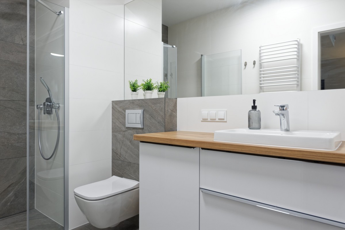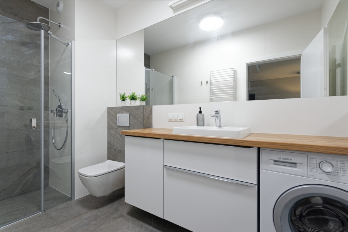 - łazienka z prysznicem i pralką, wyposażona w funkcjonalną szafkę w zabudowie;