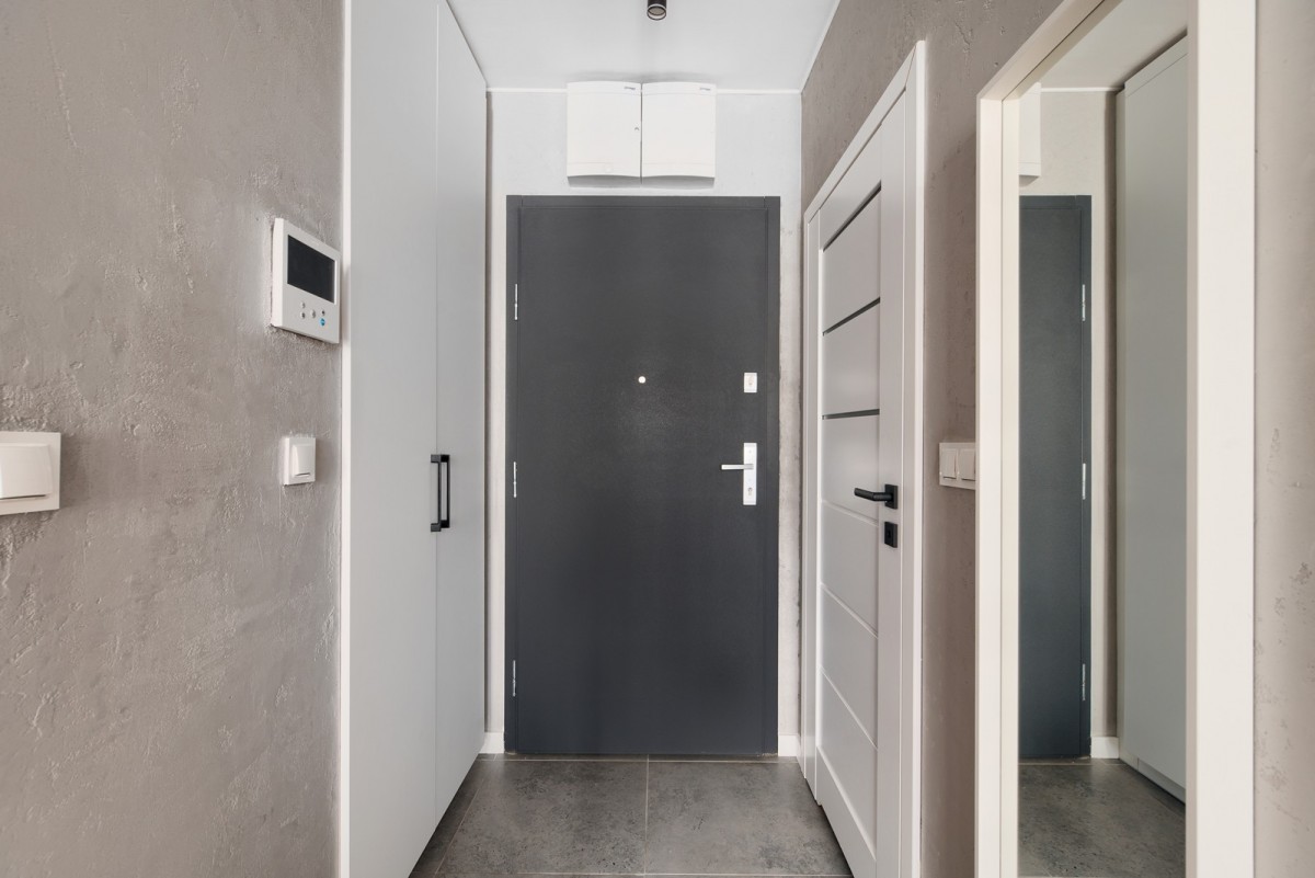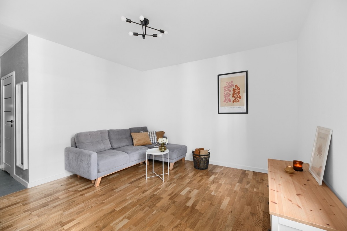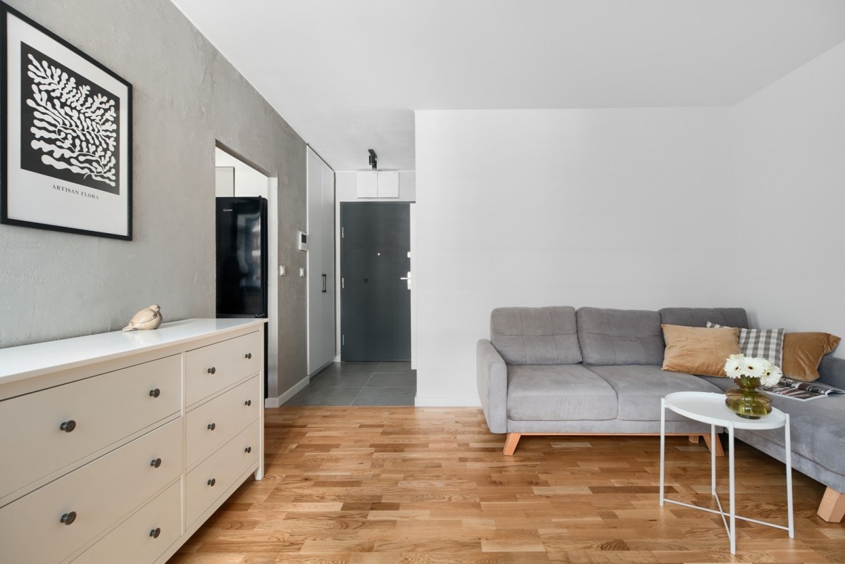 Mieszkanie zostało zaprojektowane z myślą o wygodzie i maksymalnym wykorzystaniu przestrzeni Zabudowa kuchenna z wszystkimi sprzętami AGD. Rozkładana sofa w salonie.
