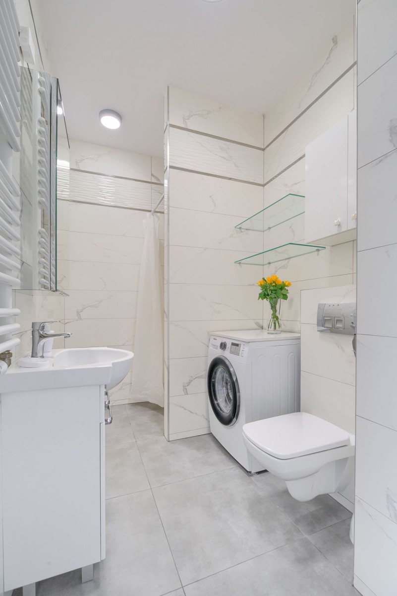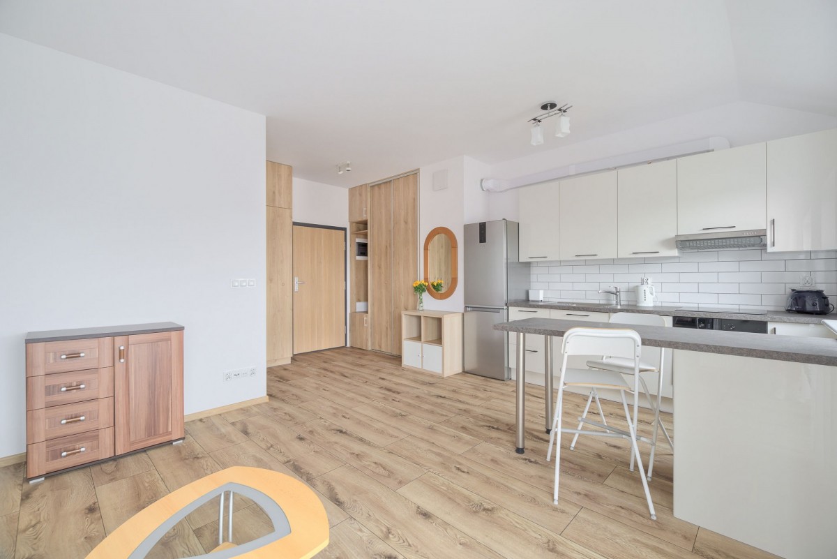 Wnętrze kawalerki wyposażone jest w dużą szafę typu komandor, komodę, stół z krzesłami i wygodną rozkładaną sofę. Aneks kuchenny został zaaranżowany z meblami w zabudowie, wyposażony w płytę indukcyjną, piekarnik, okap i dużą lodówkę. Łazienka wyposażona jest w prysznic oraz pralkę, a na podłogach znajdują się panele i płytki. Otoczenie mieszkania to spokojne i ciche osiedle, w bezpiecznym sąsiedztwie. W najbliższej okolicy można cieszyć się pięknymi terenami, takimi jak Wartostrada, trasy spacerowe, biegowe i rowerowe.