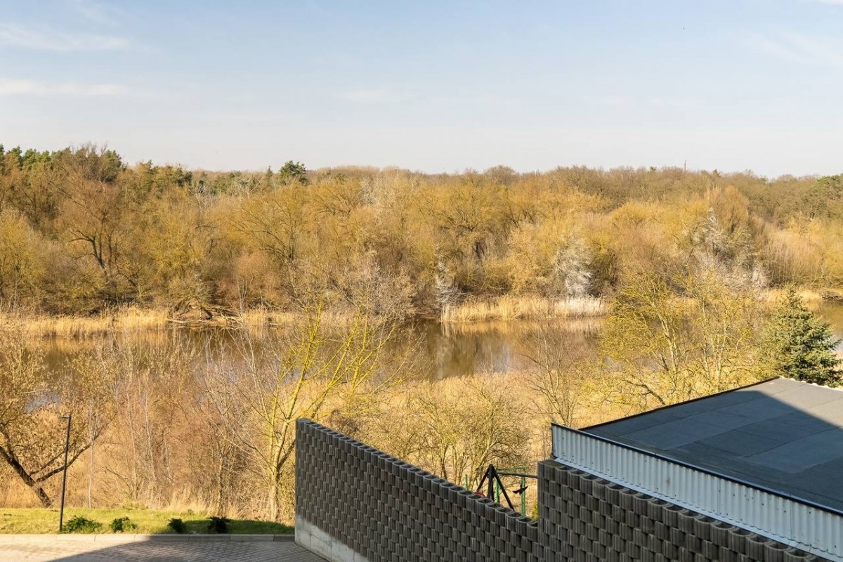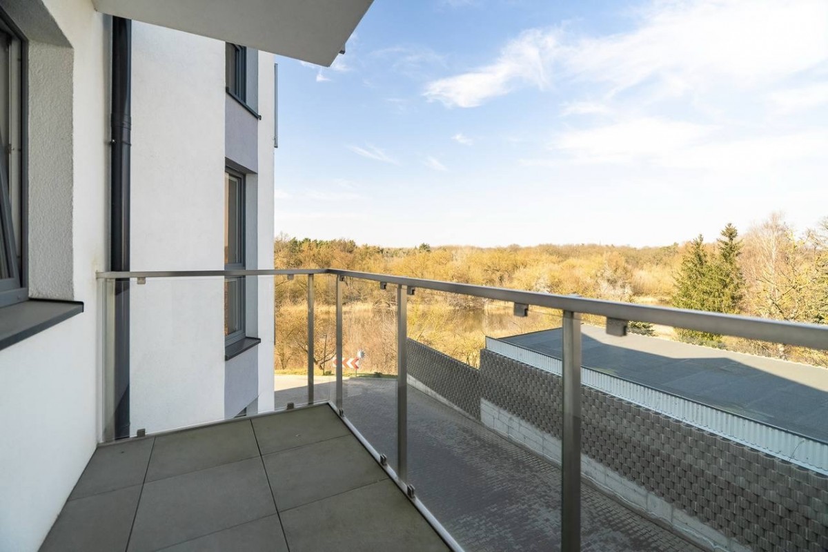 balkon z widokiem na Wartę i tereny zielone,