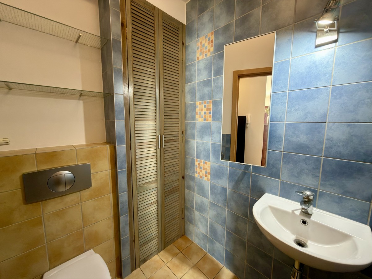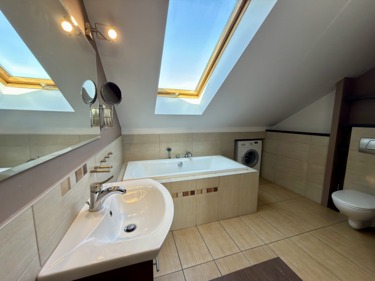 - duża łazienka z oknem o powierzchni ok. 7 m², wyposażona w wannę, WC, umywalkę oraz ogrzewanie podłogowe.