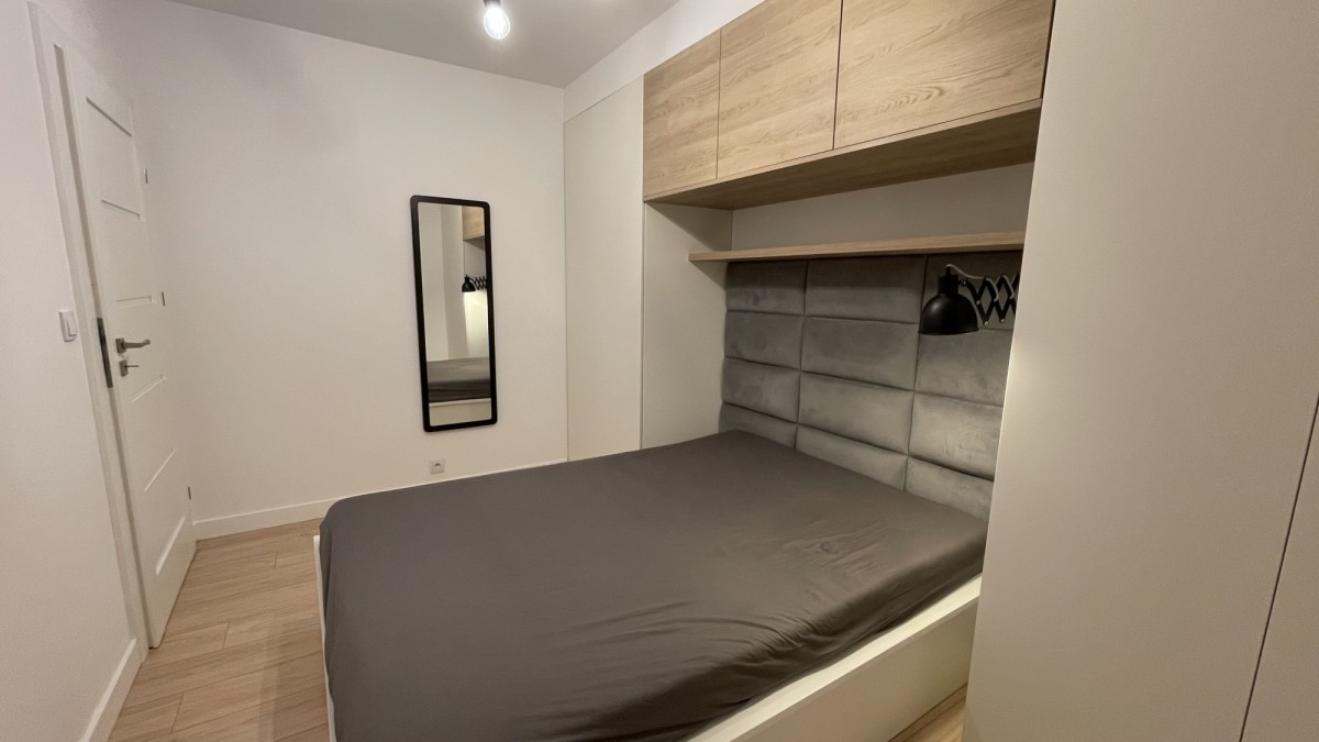 ✔ Sypialnia z łóżkiem 160 × 200, rozbudowaną zabudową stolarską wokół łóżka, dwiema szafami oraz zabudową nad wezgłowiem,