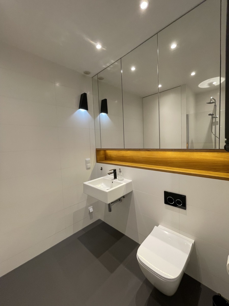 ✔ Nowoczesna łazienka - toaleta i umywalka w zabudowie, pojemne szafki z lustrami, prysznic w zabudowie oraz pralka ukryta w zabudowie z dodatkowymi półkami.