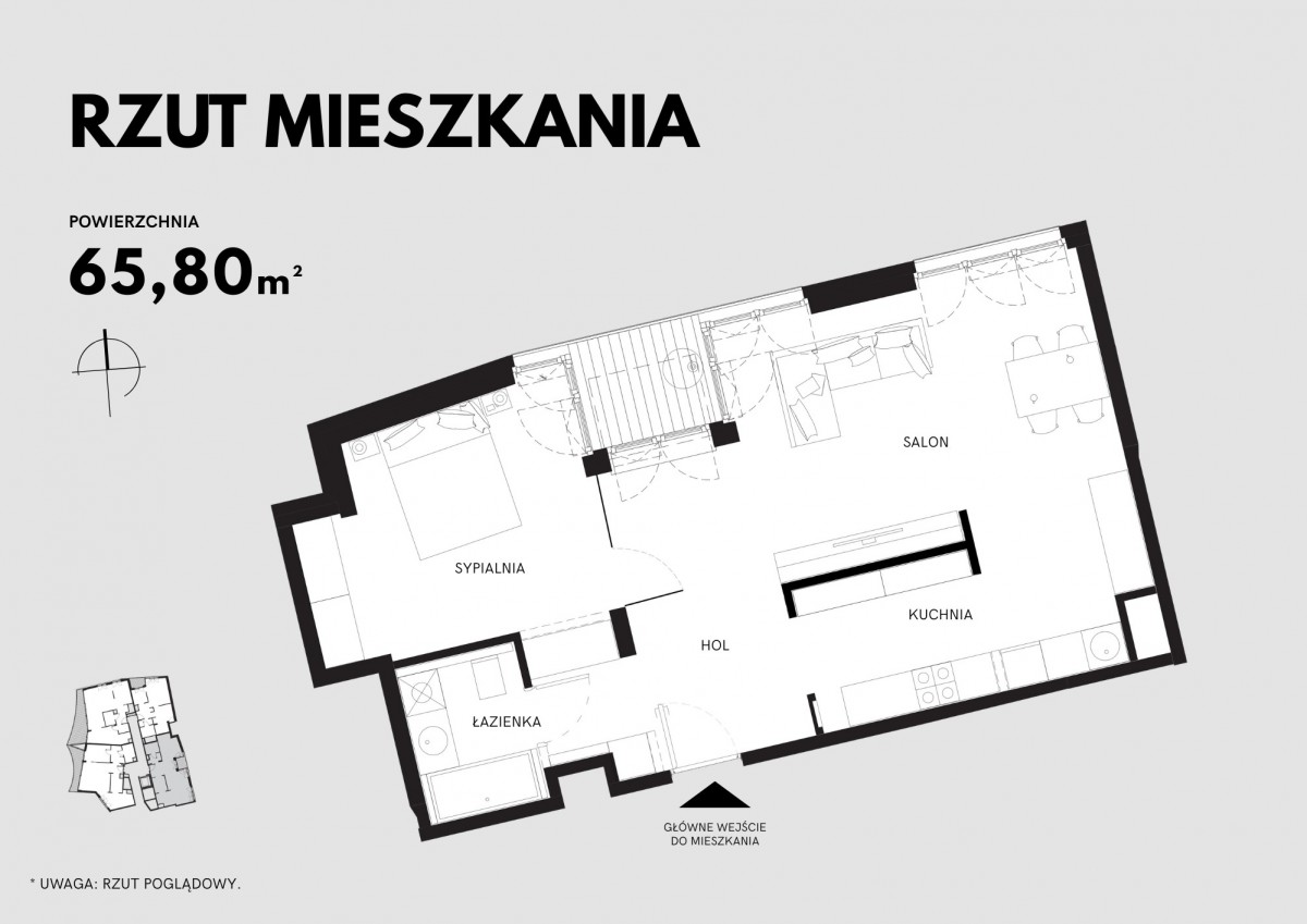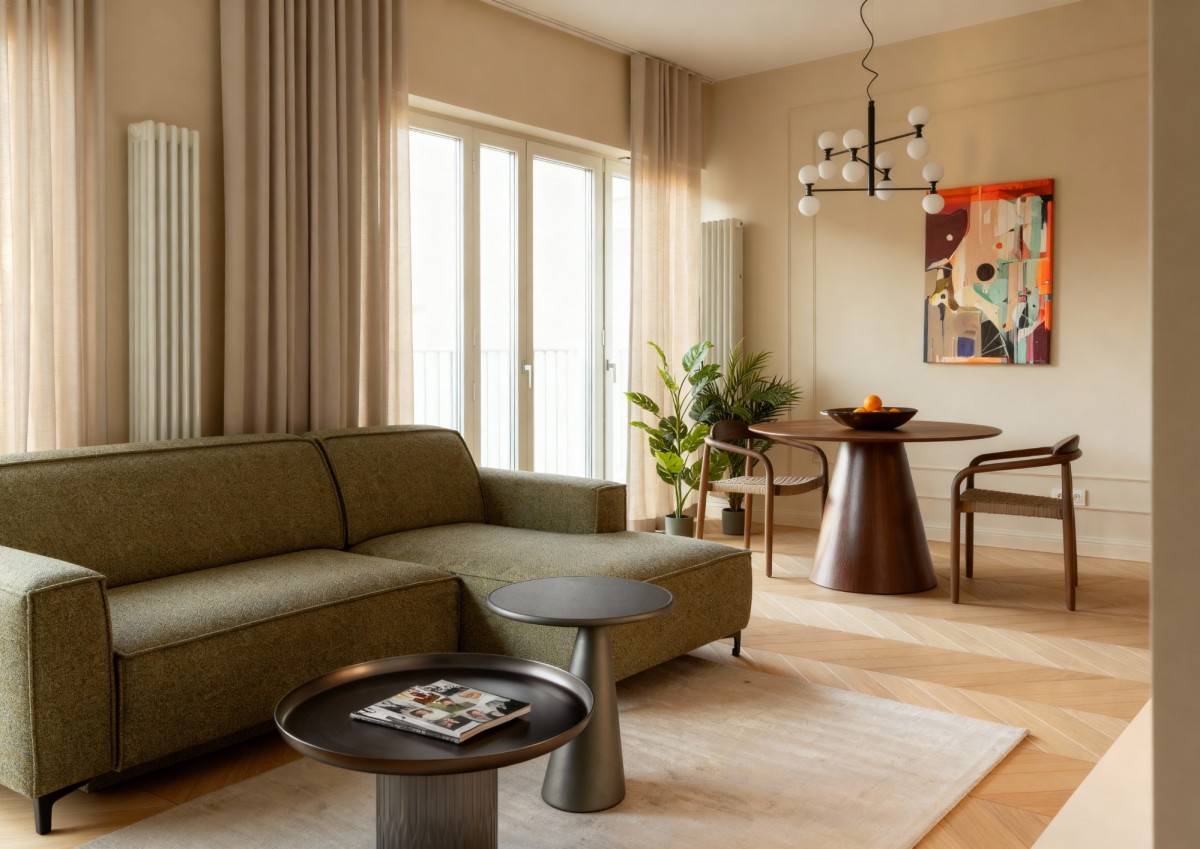 - Salon: sofa, stół z dwoma krzesłami, dywan,