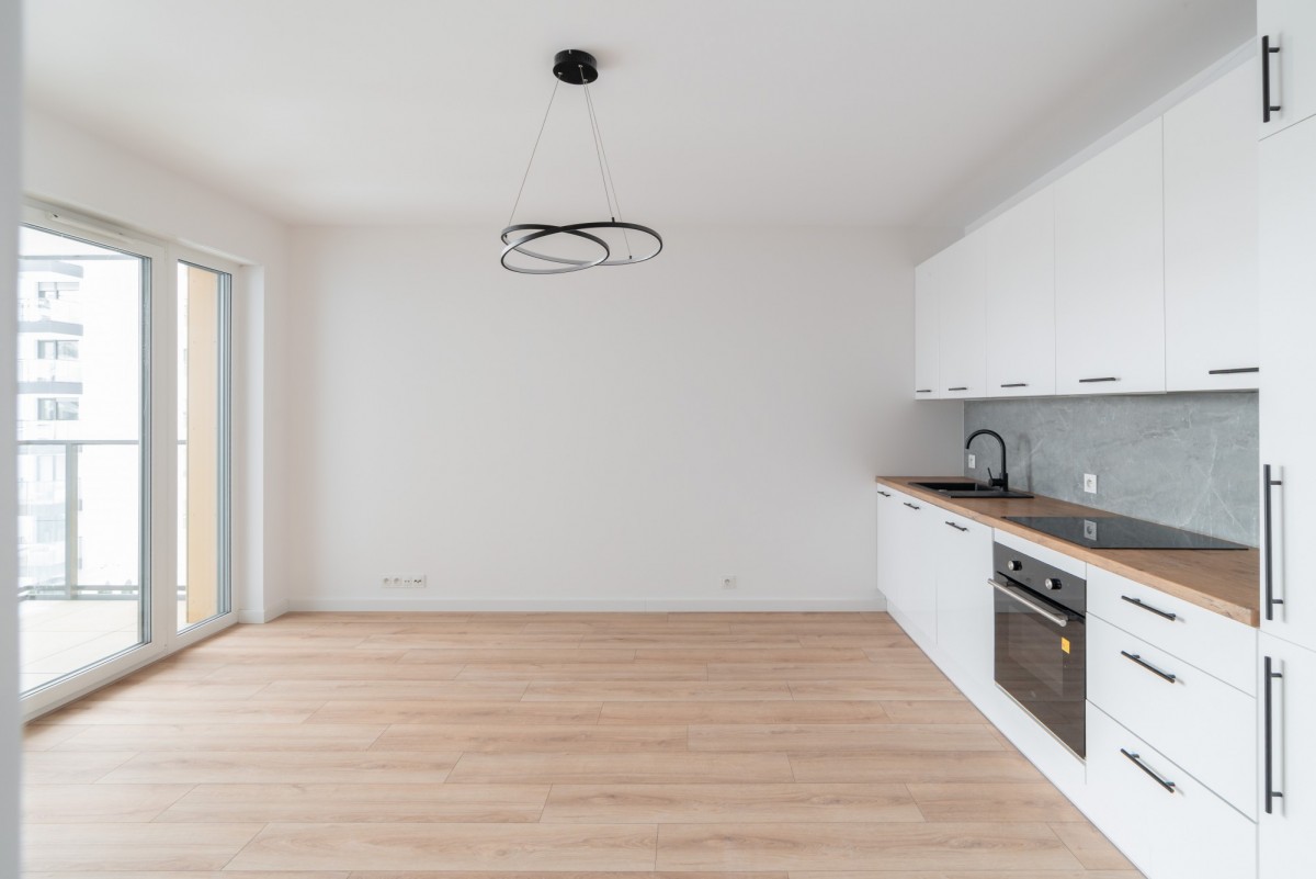 salon z aneksem kuchennym oraz wyjściem na balkon,