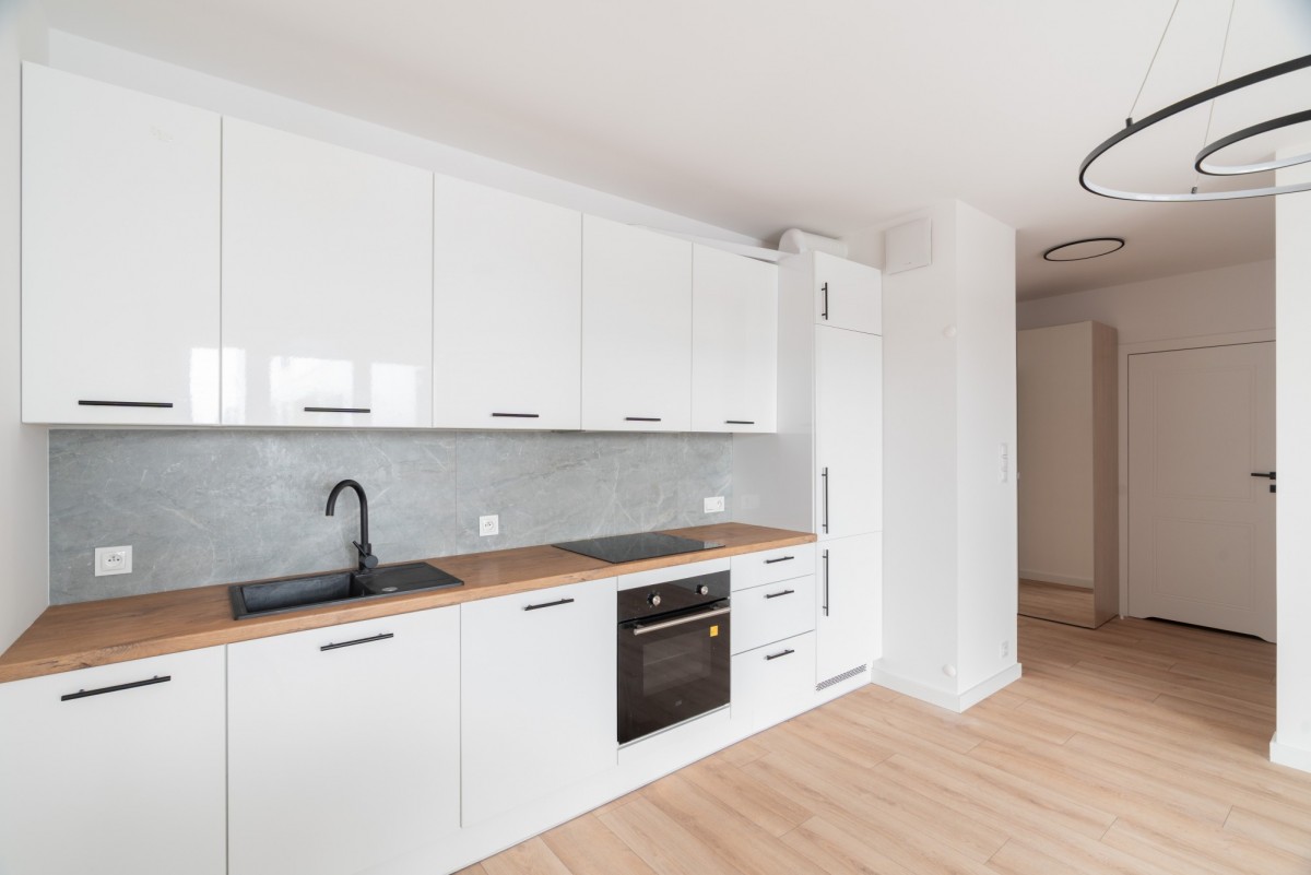 Kuchnia została wyposażona w nowoczesną zabudowę oraz sprzęt AGD, a łazienka wykończona w spójnej, stonowanej kolorystyce.