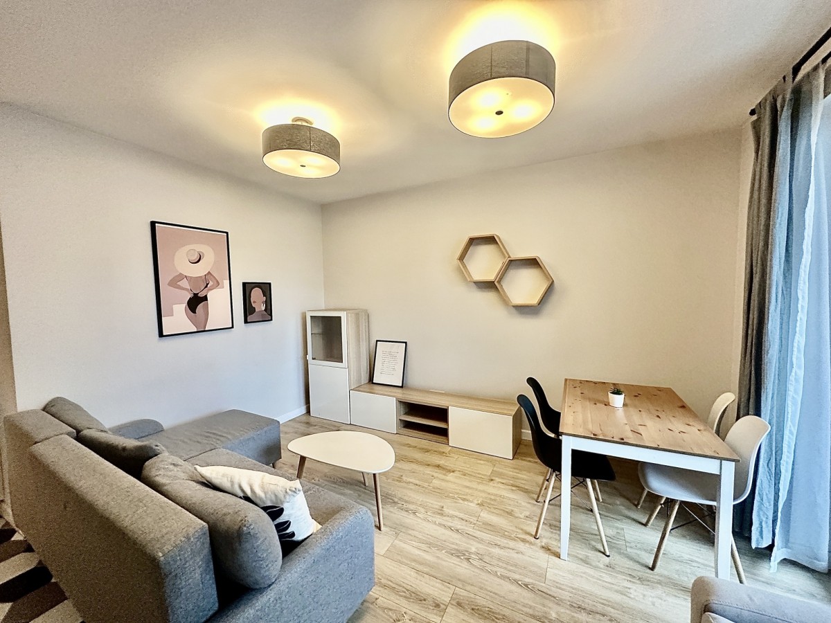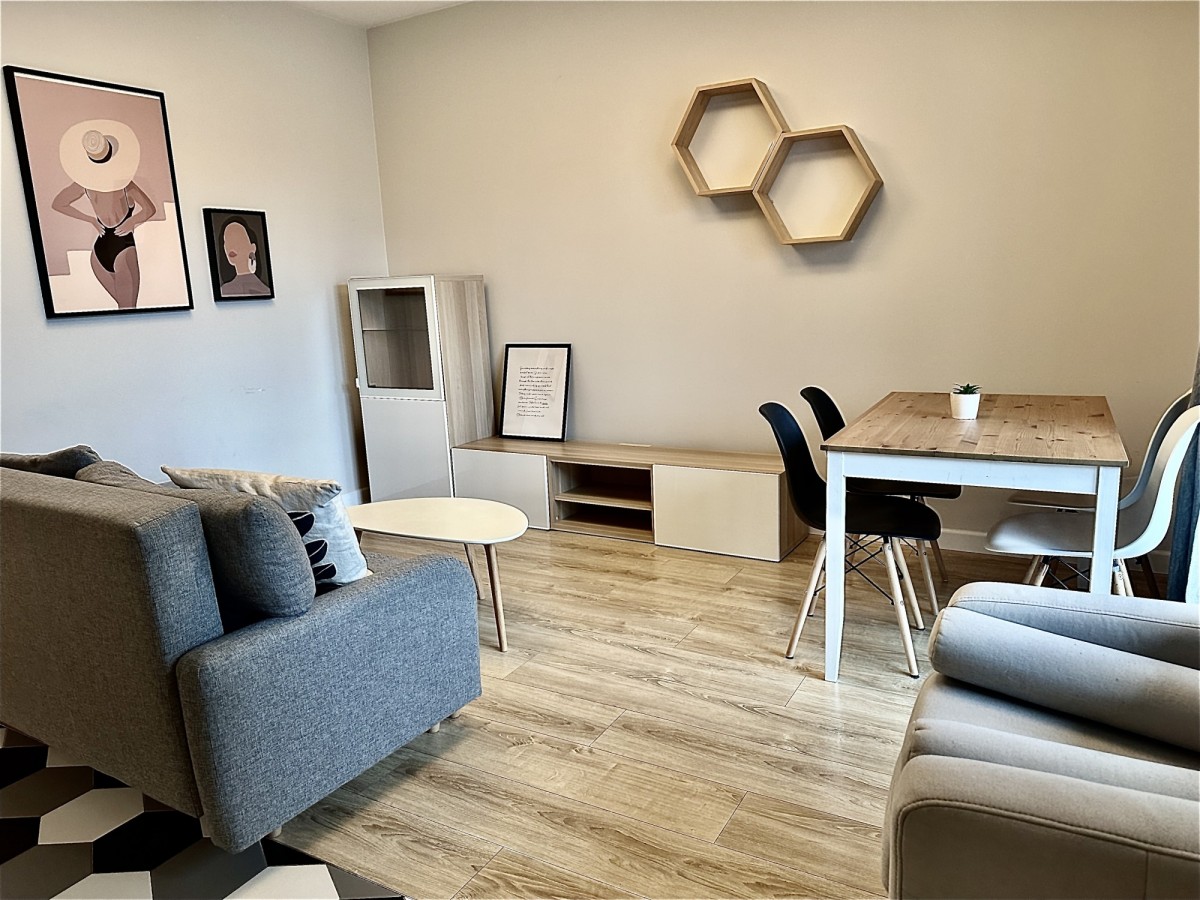 Pokój 1 (salon z aneksem kuchennym): kanapa z funkcją spania, stolik kawowy, stół i 4 krzesła, zestaw szafek, zasłony, firany;