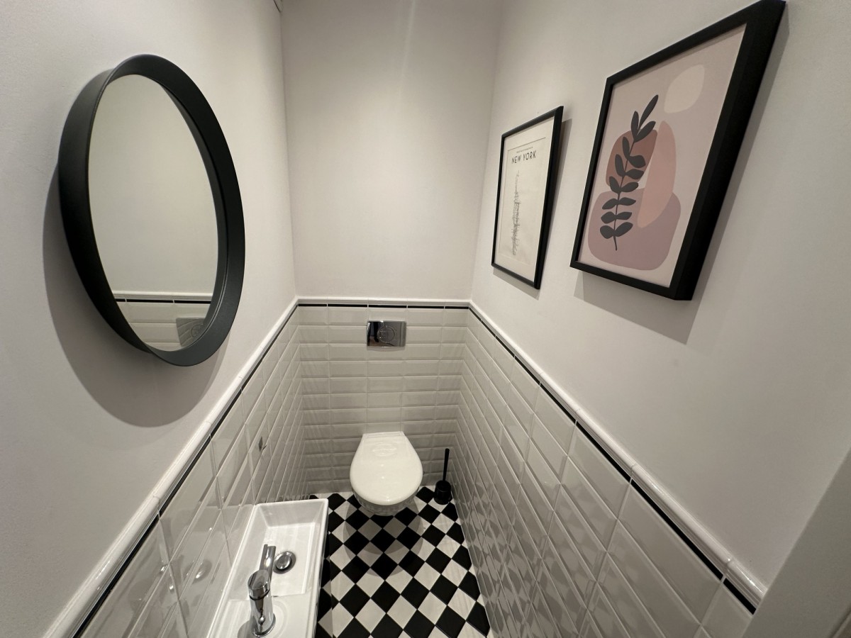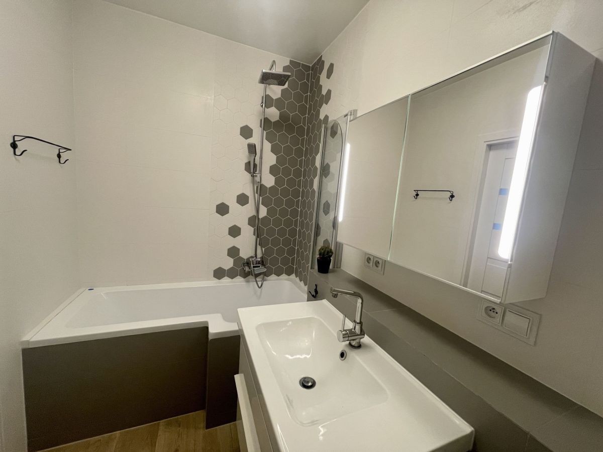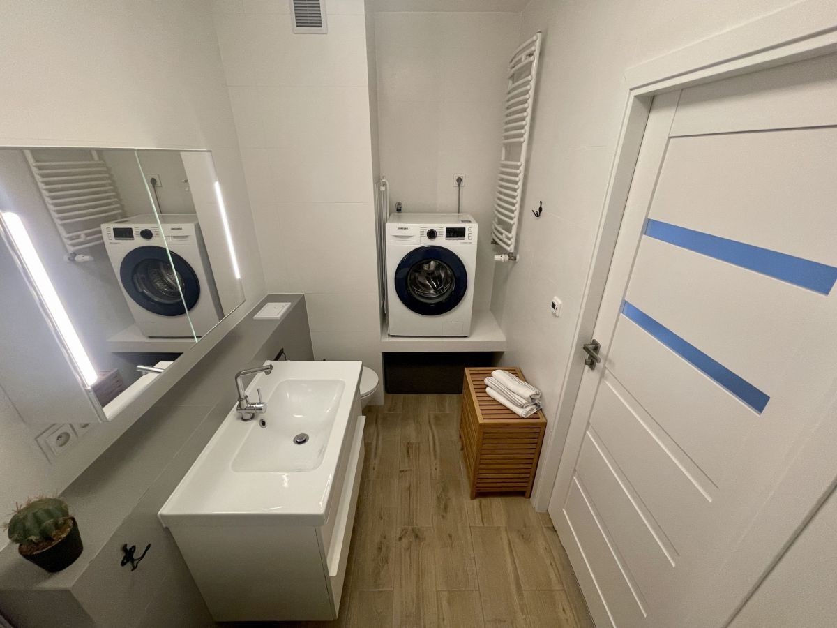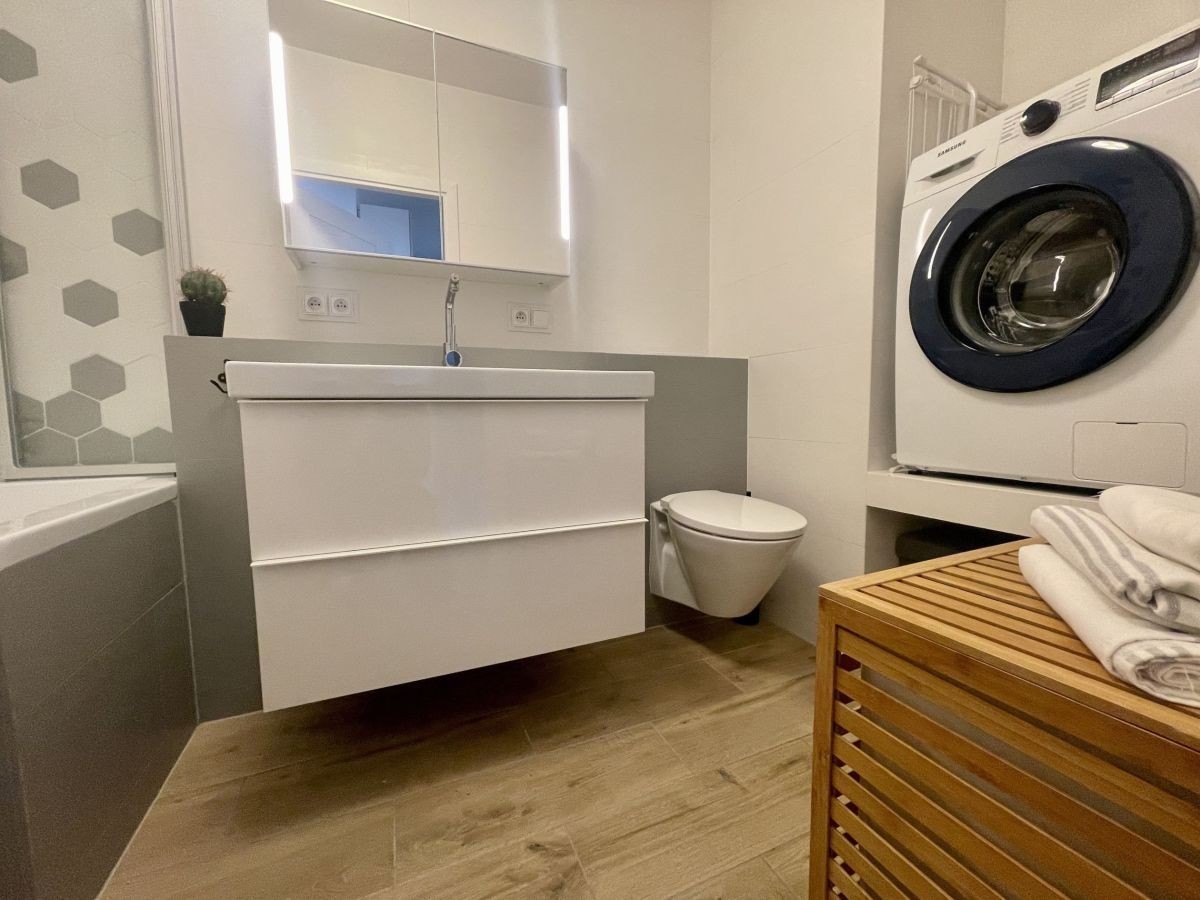 Łazienka: wanna z funkcją prysznica, pralka, szafki; ogrzewanie podłogowe.