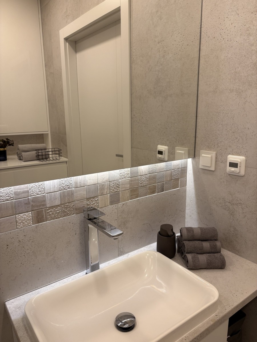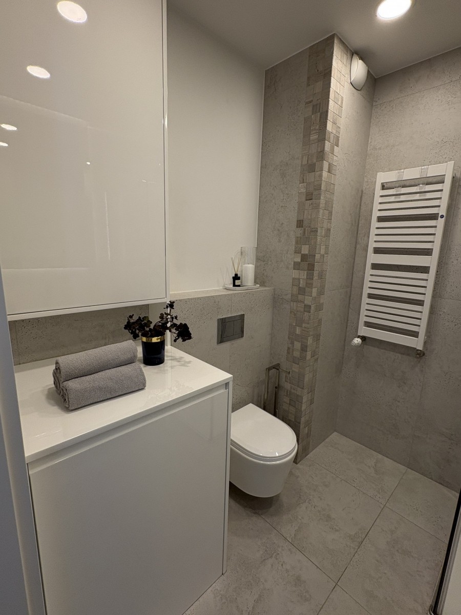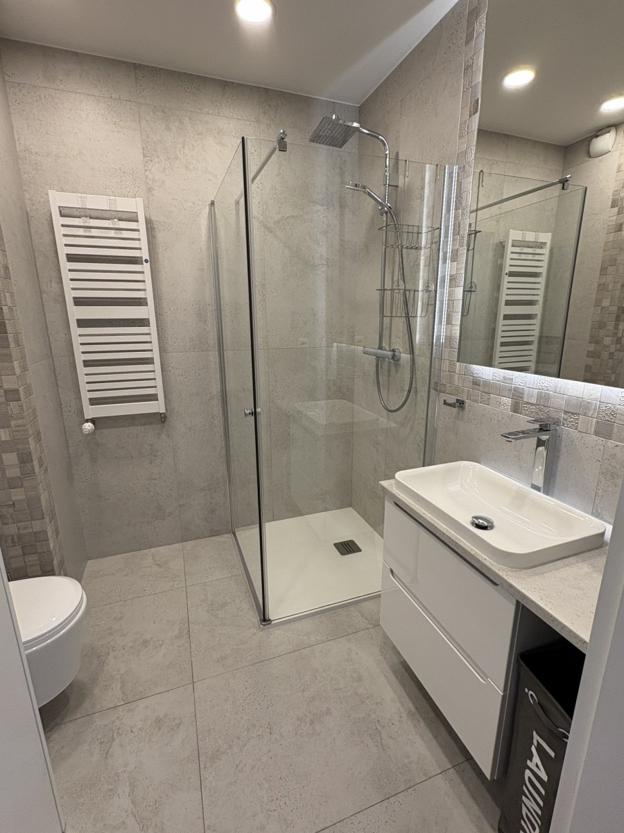 Łazienka: elegancka, z kabiną prysznicową i pralką