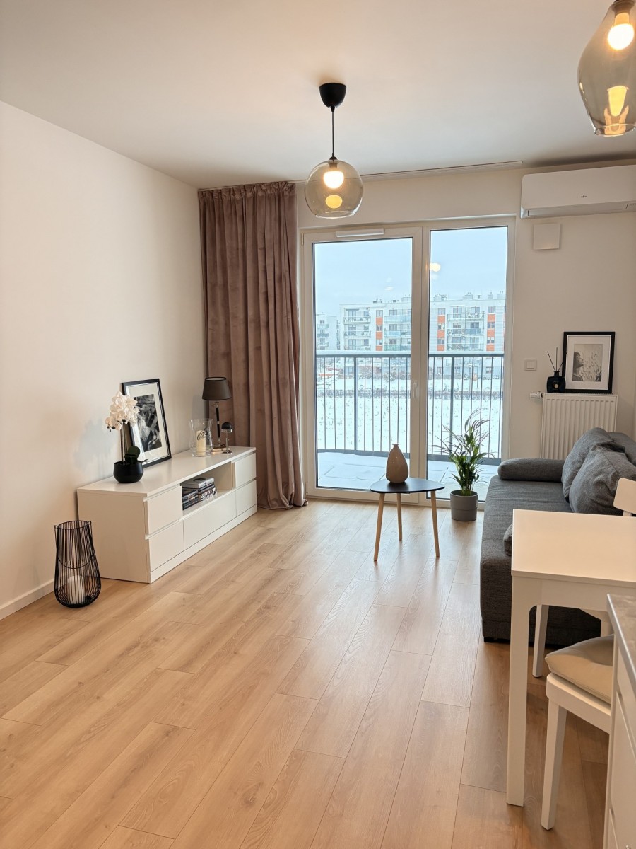 Umeblowanie: kuchnia w pełni wyposażona, salon gotowy do zamieszkania, sypialnia z dużą, pojemną szafą