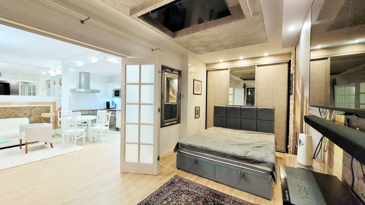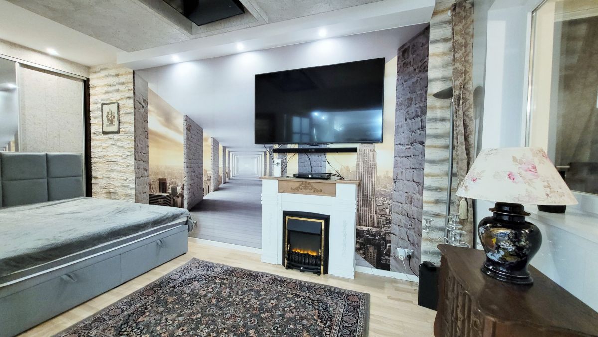 Sypialnia, w której znajduje się wygodne łóżko z materacem została doposażona w tworzący przytulny klimat bio kominek elektryczny. W sypialni znajdują się dwa telewizory w tym jeden podwieszany wygodny do oglądania w łóżku, super sprzęt audio i pojemna szafa w zabudowie.