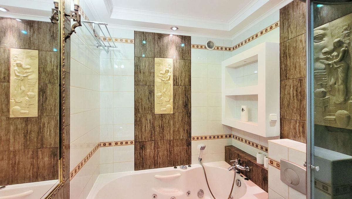 Łazienka z wanną z hydromasażem oraz kabiną prysznicową z funkcją ozonoterapii, światłoterapii i sauny parowej.