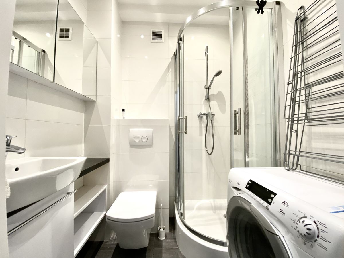 - Łazienka z prysznicem oraz pralką.