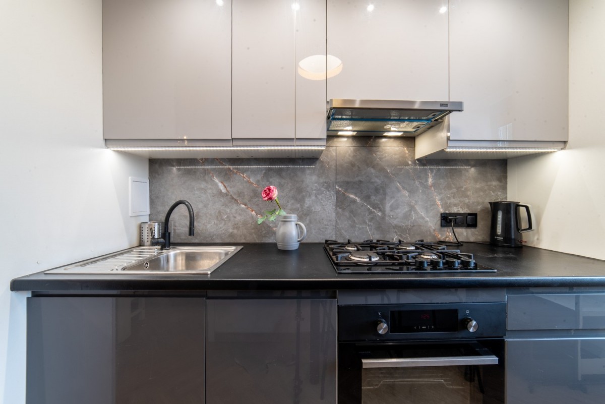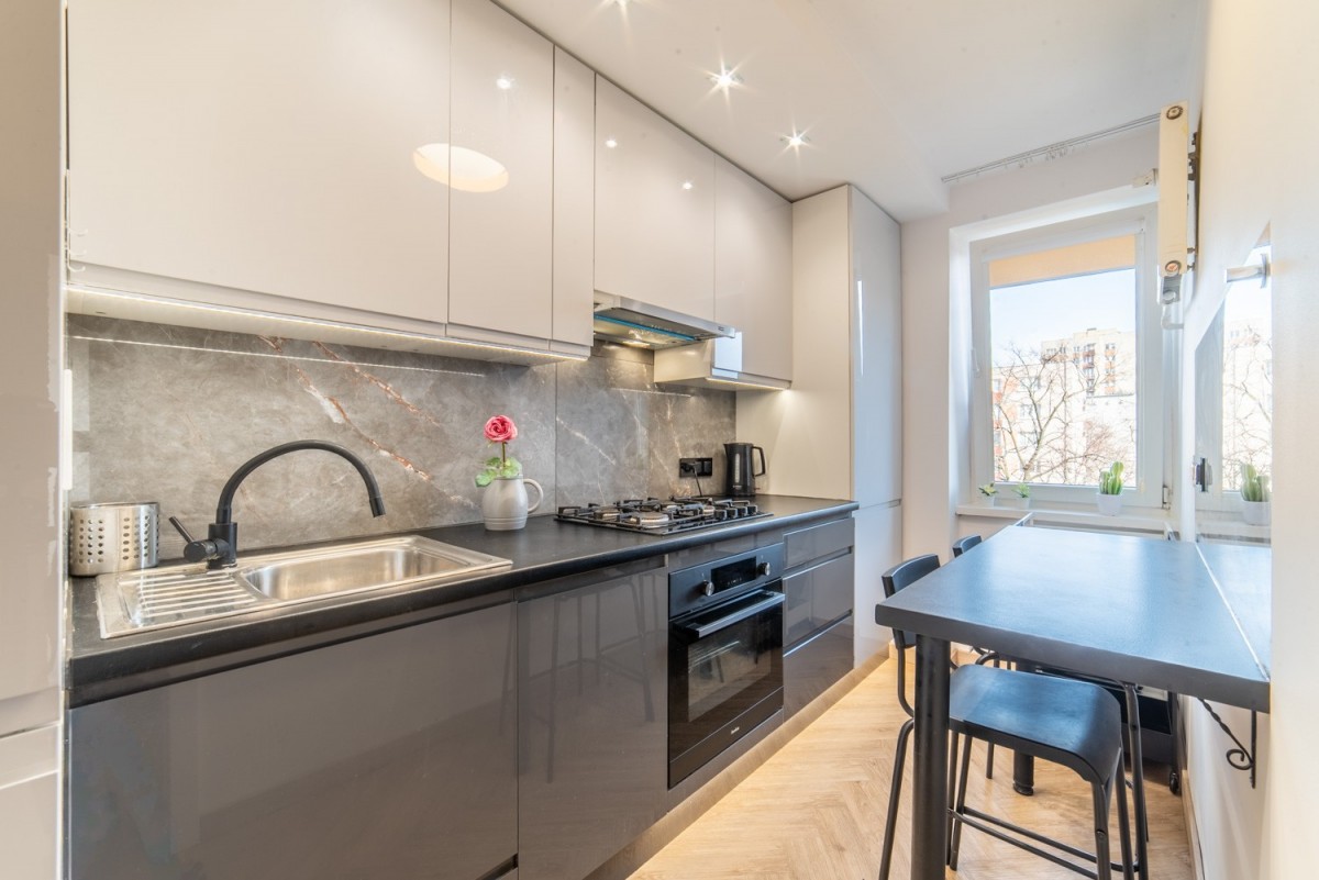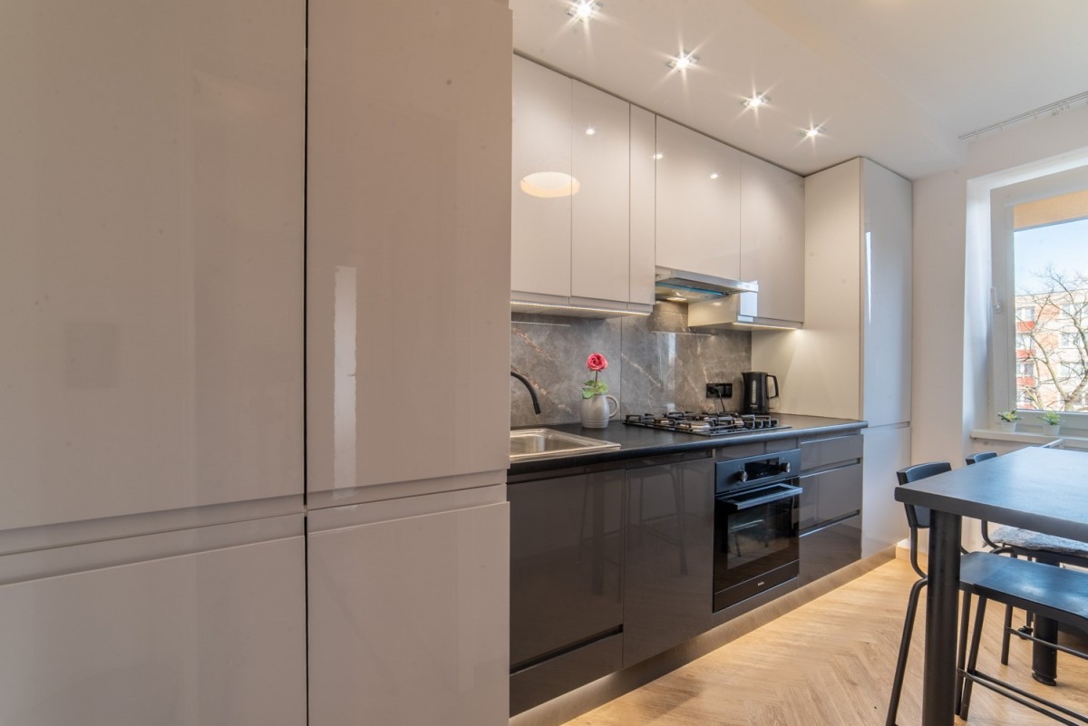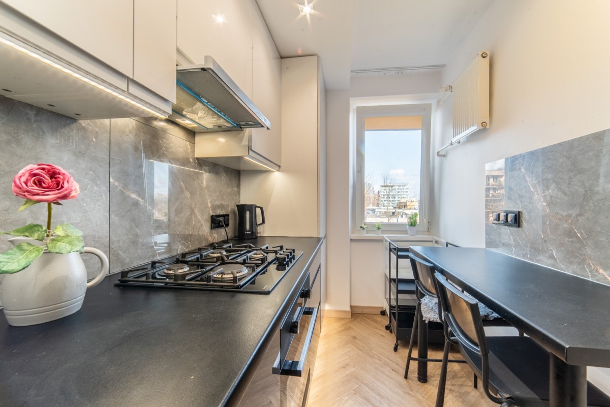 Oddzielna zamykana kuchnia z oknem, wyposażona w sprzęt AGD (nowoczesny piekarnik, płytę gazową, lodówkę i zmywarkę oraz pralkę), szafki kuchenne, zlewozmywak, talerze, szklanki i sztućce.