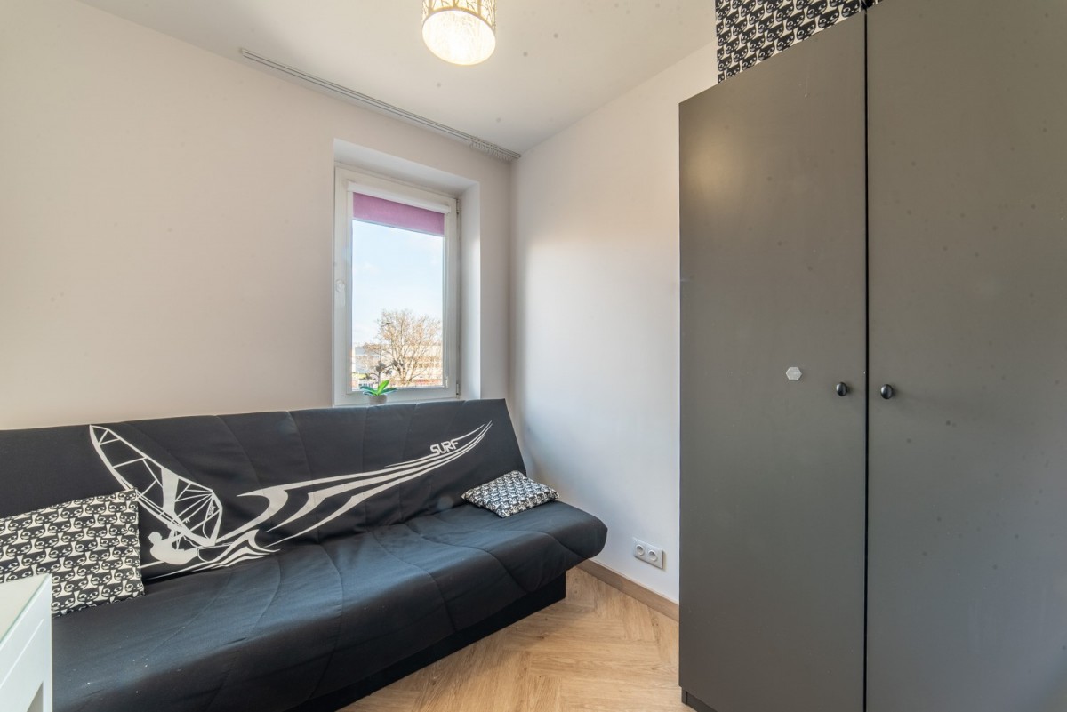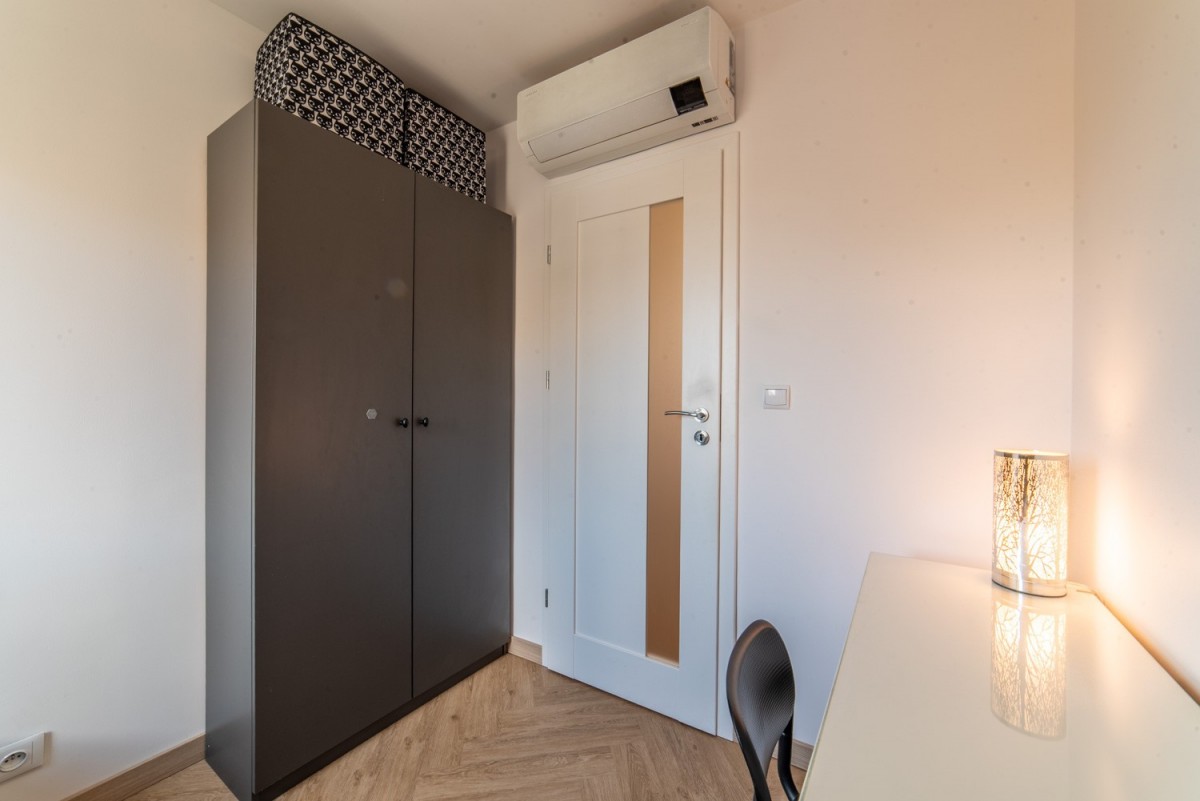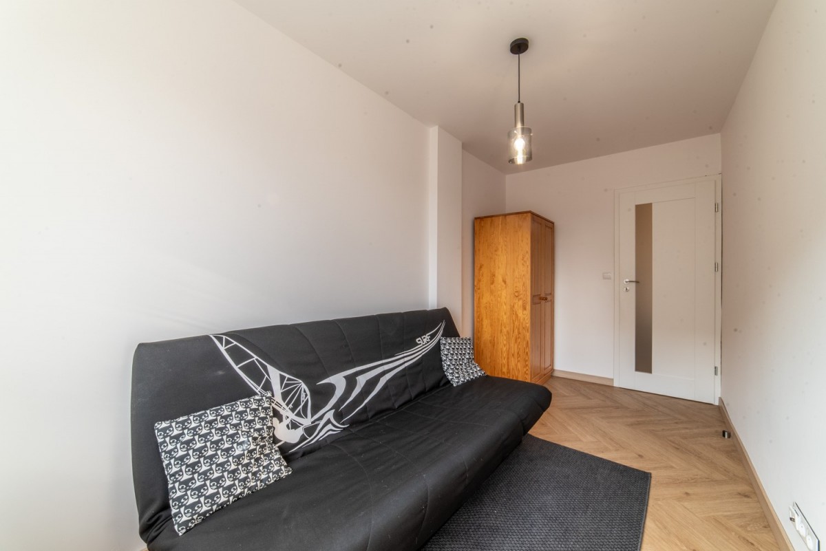 Każdy pokój z rozkładaną kanapą, stołem i szafami.