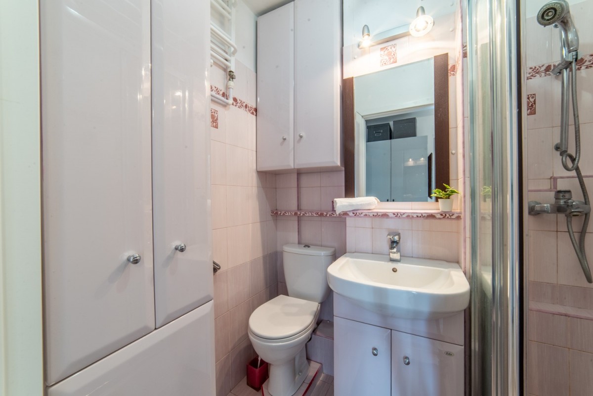 Łazienka z kabiną prysznicową i lustrem oraz szafkami w zabudowie meblowej.
