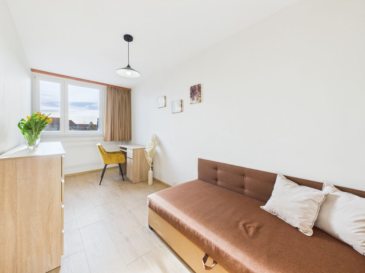 Mieszkanie jest w pełni umeblowane nowymi, stylowymi meblami. W salonie znajduje się rozkładana kanapa, stół z czterema krzesłami, komoda oraz szafka RTV. Sypialnia wyposażona jest w duże łóżko, szafkę nocną i szafę. Pokój dodatkowy zawiera łóżko, biurko, komodę i krzesło.