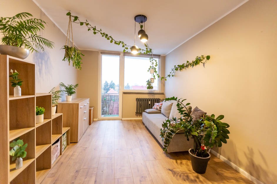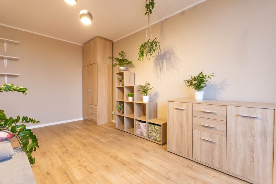 2. Salon z wyjściem na balkon, wyposażony w rozkładaną kanapę oraz pojemną szafę, komodę i półki.