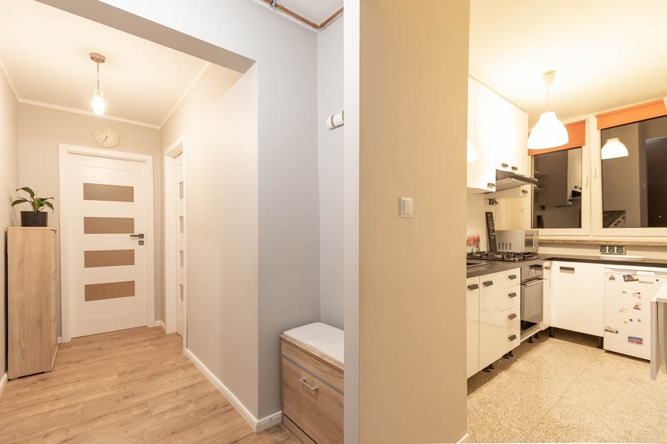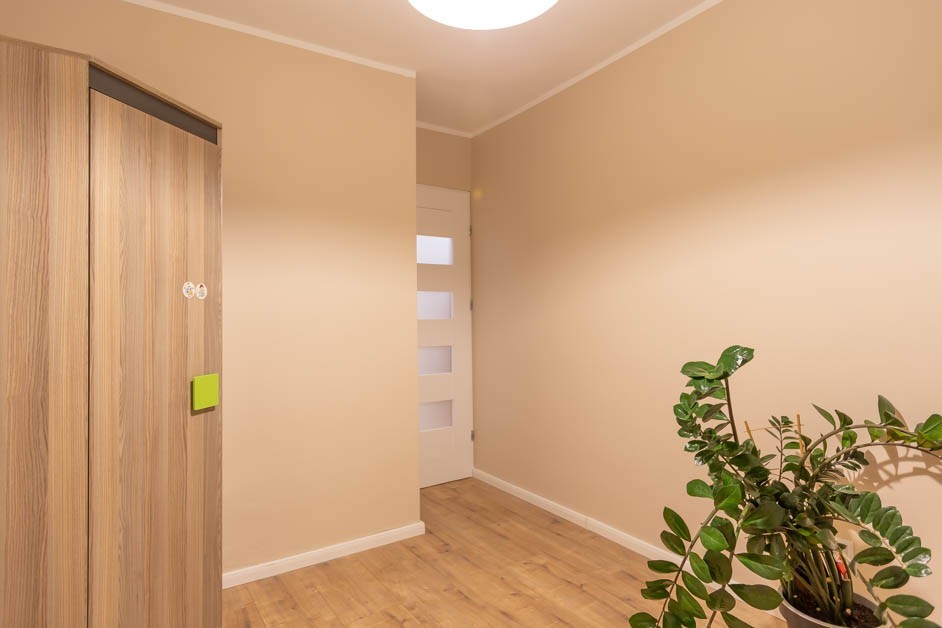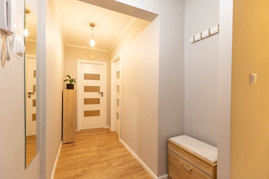 5. Przedpokój z szafką na buty, wieszak na kurtki oraz lustro.
