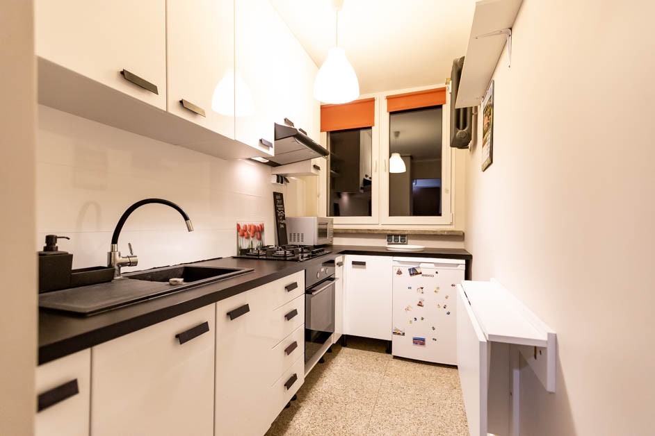 1. Kuchnia z oknem wyposażona m.in. w meble kuchenne, lodówkę, kuchenkę gazową wraz z piekarnikiem elektrycznym, zlew.