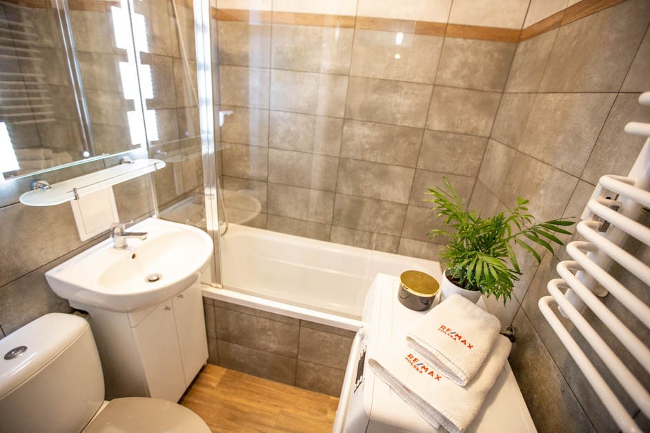 5. Łazienka z wanną z prysznicem, toaletą, pralką, umywalką oraz lustrem + grzejnik drabinkowy.