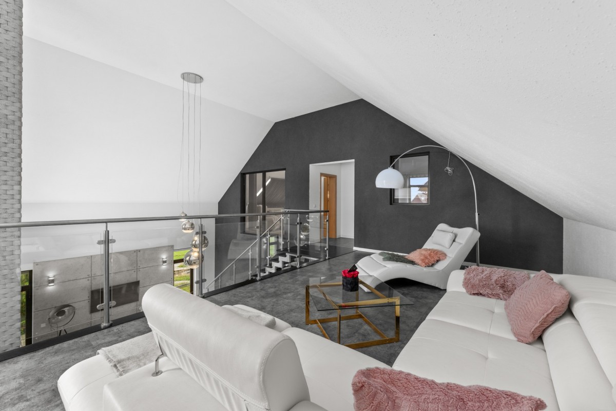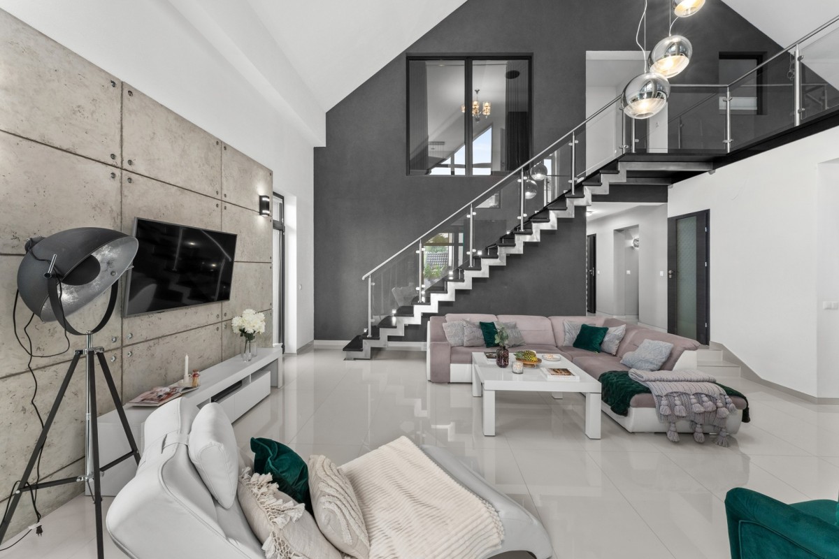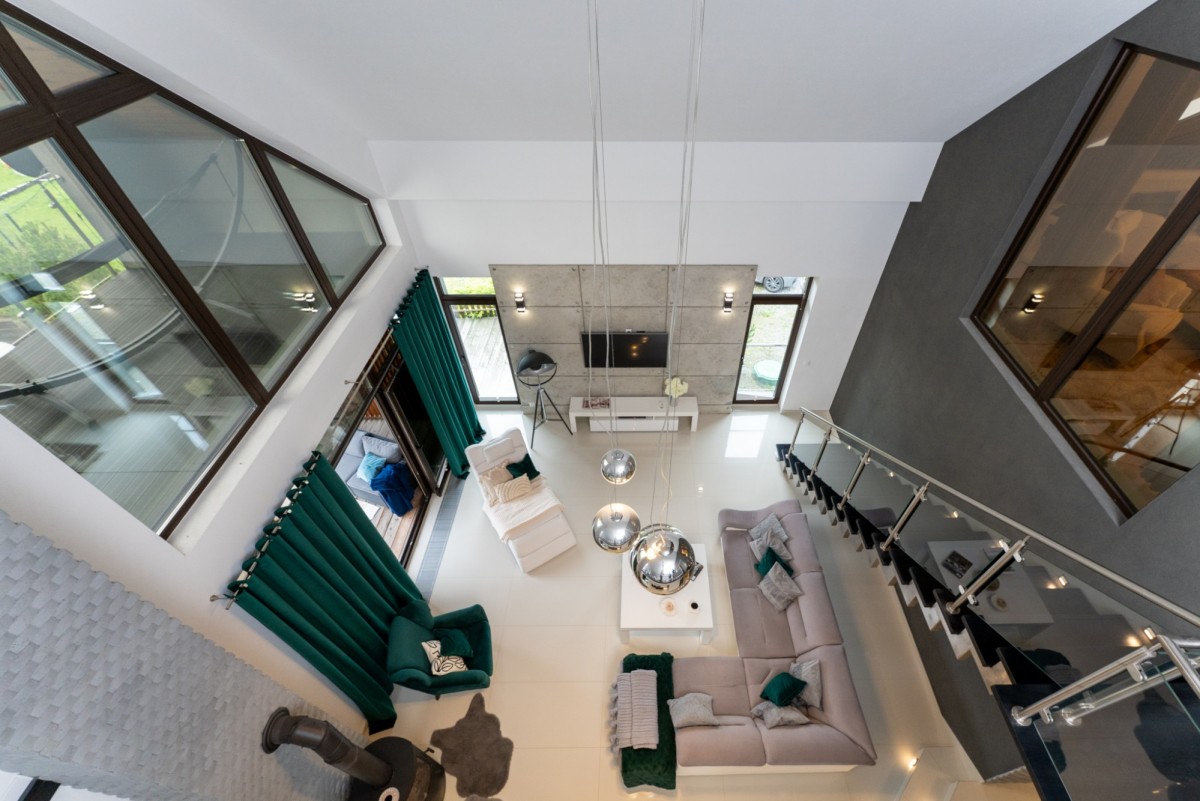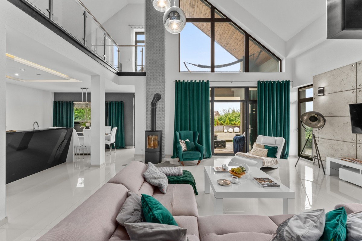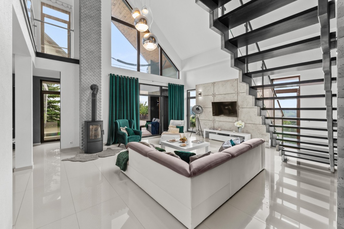 Przestronny salon z kominkiem i panoramicznymi przeszkleniami naturalnie otwiera dom na widok Tatr - to centrum życia, które działa zarówno na co dzień, jak i przy przyjmowaniu gości.
