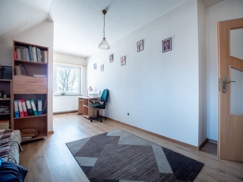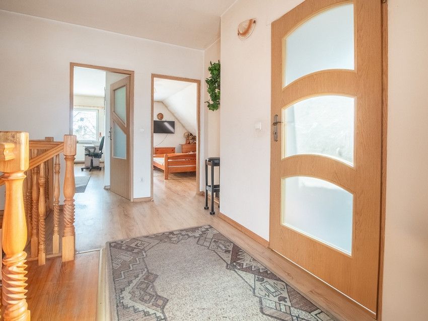 - Na piętrze: 2 sypialnie - 17,86 m² i 16,47 m², łazienka - 4,35 m², hol - 11,11 m².