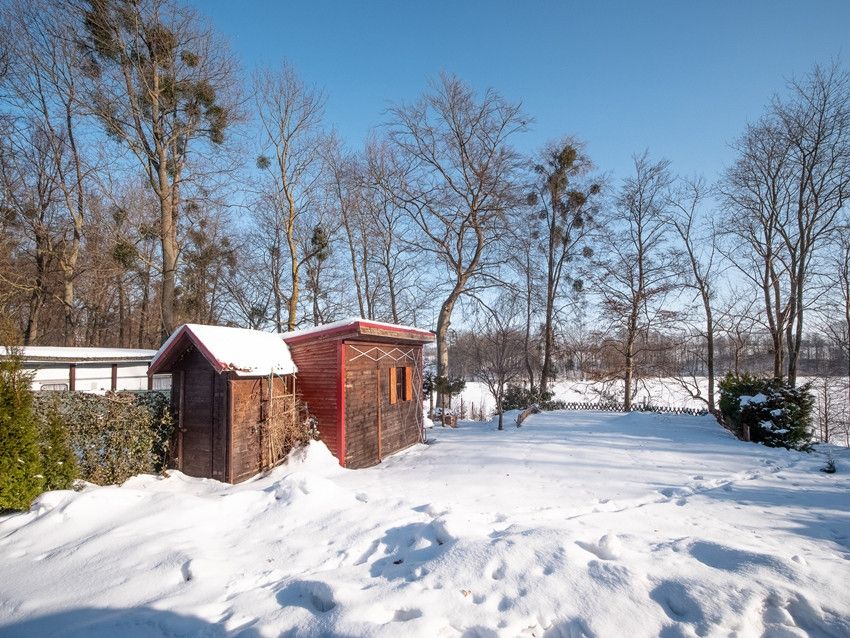 Na działce szopka na narzędzia i drewniany garaż.