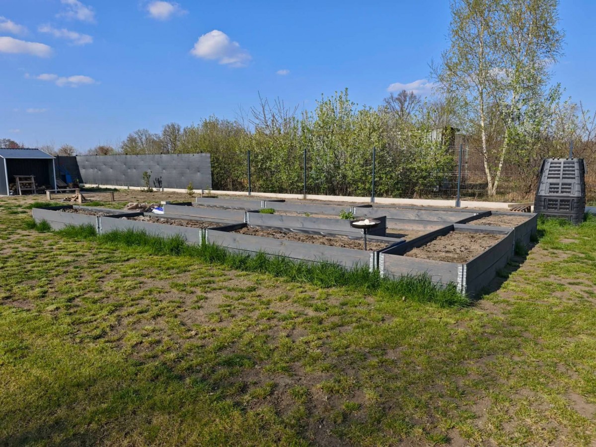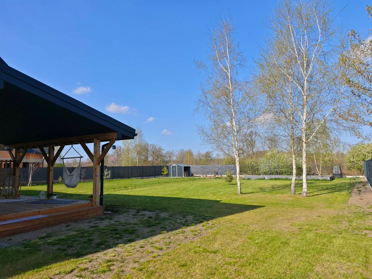 zadaszony taras 15 m².OGRÓD I DZIAŁKAZagospodarowanie: Teren w pełni ogrodzony, liczne nasadzenia (sosny, brzozy, lawenda, maliny), wydzielone grządki.
