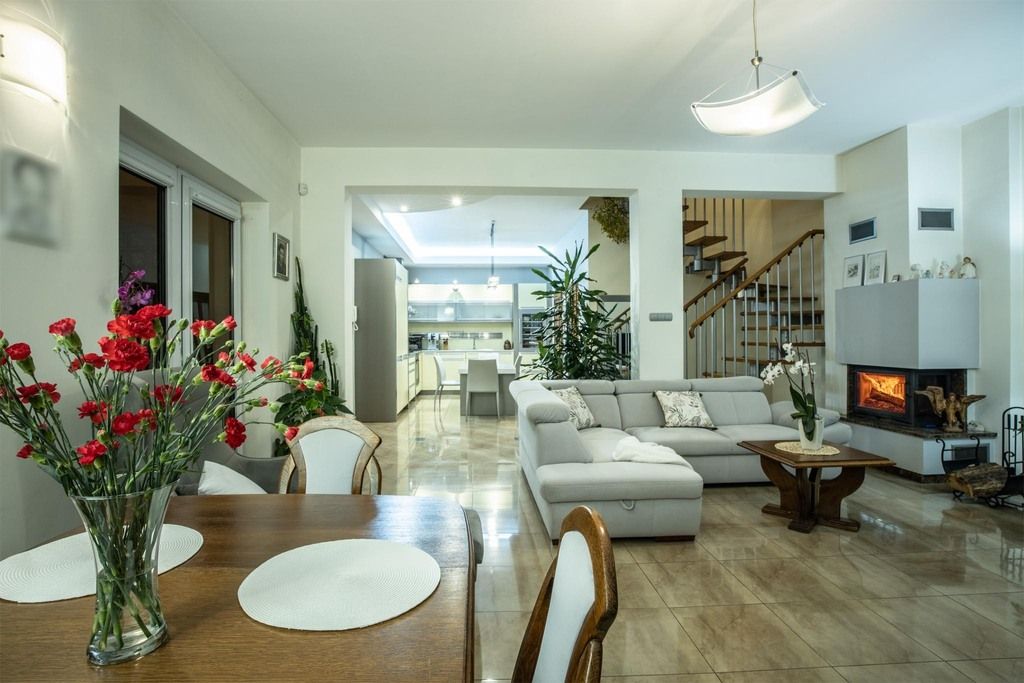 - duży, otwarty salon z kominkiem,