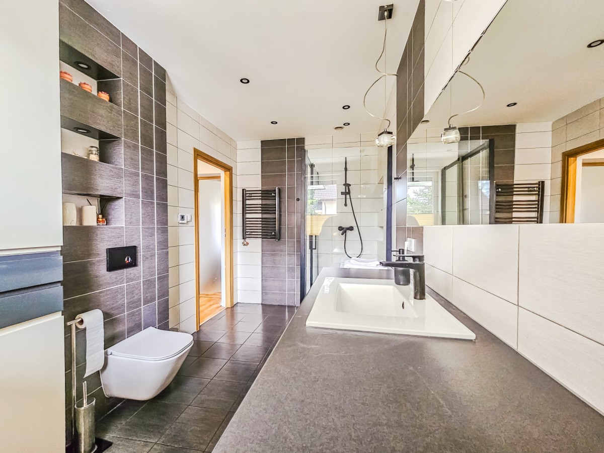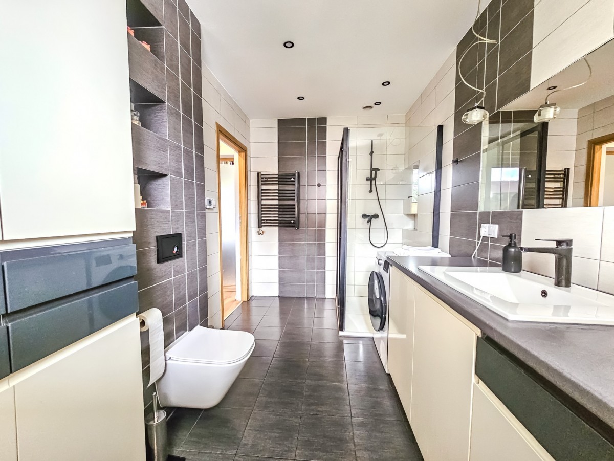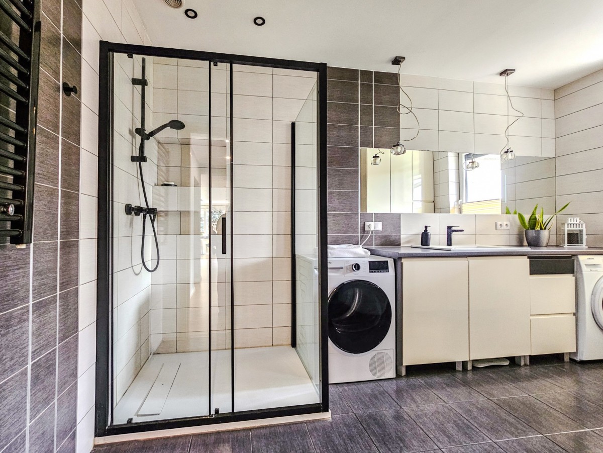 łazienka z dużą kabiną prysznicową oraz zabudową meblową.