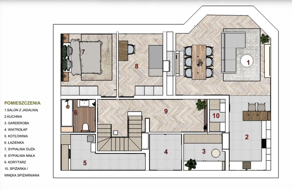- Garderoba – praktyczna przestrzeń do przechowywania.
