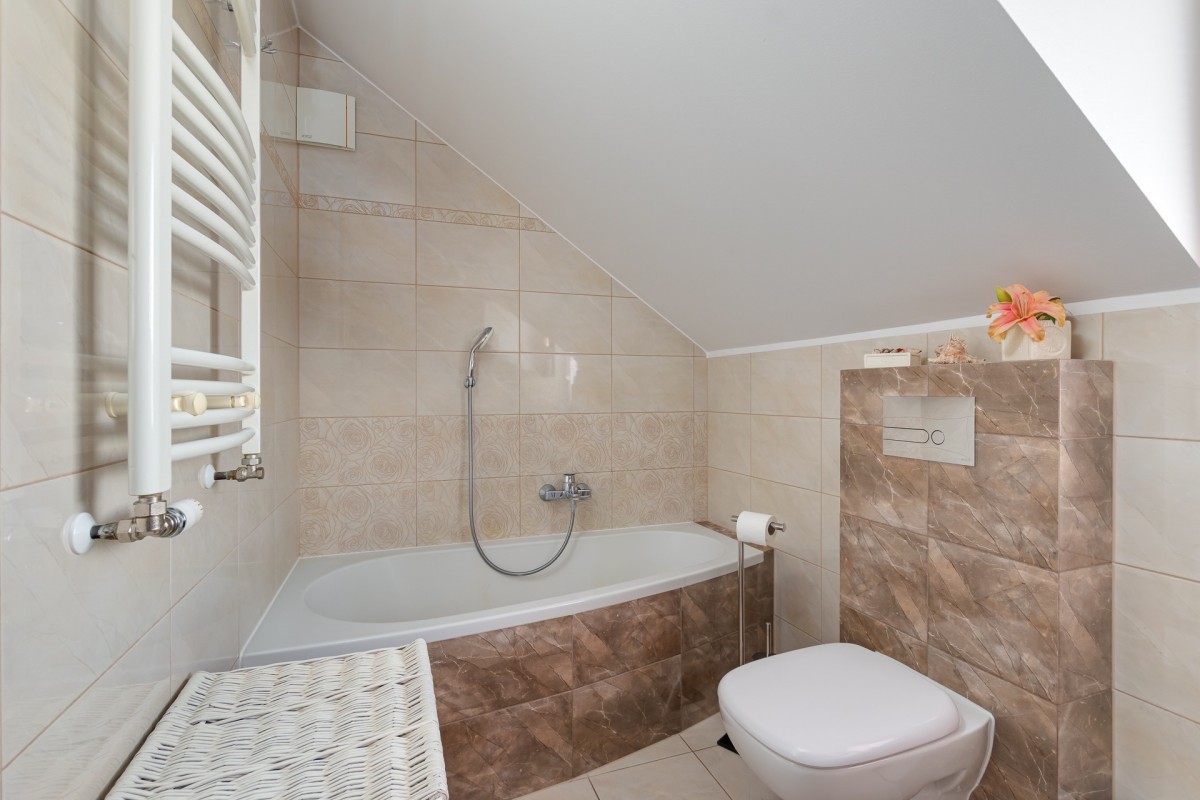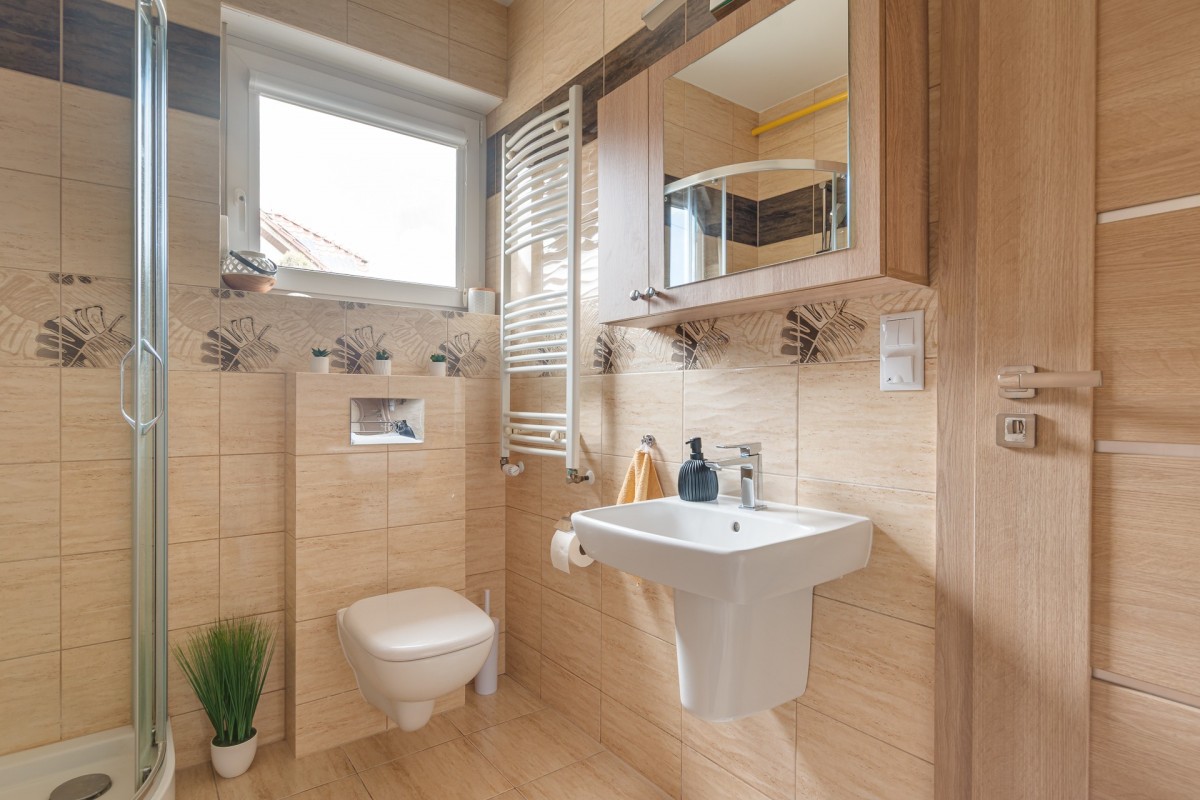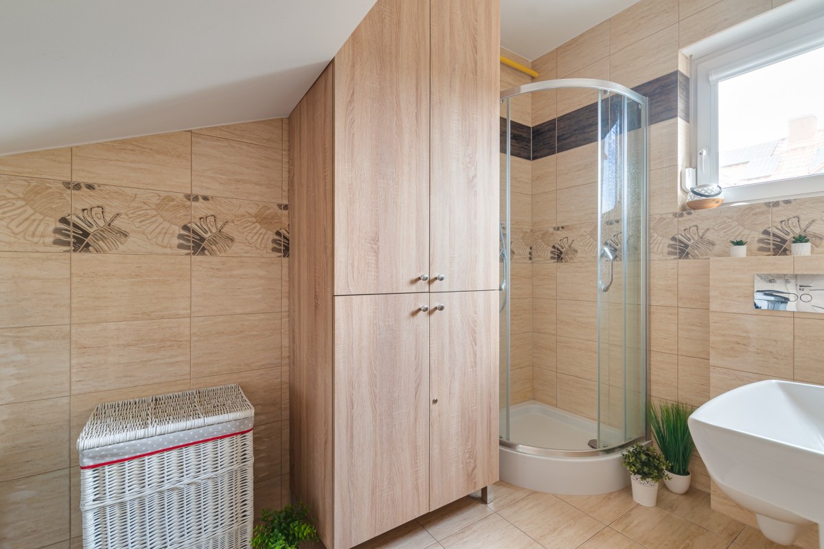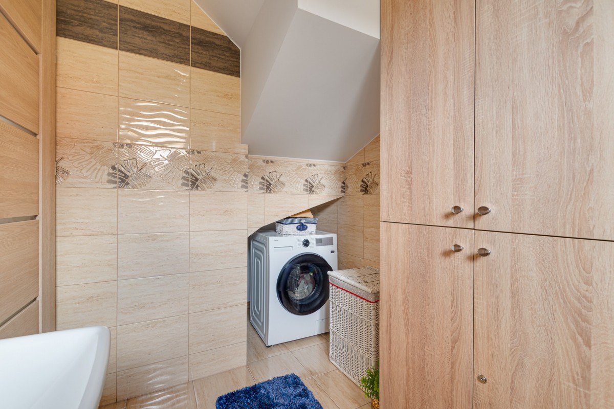 - łazienka z prysznicem i pralką, piec gazowy z zasobnikiem marki Viessmann został zabudowany szafką.