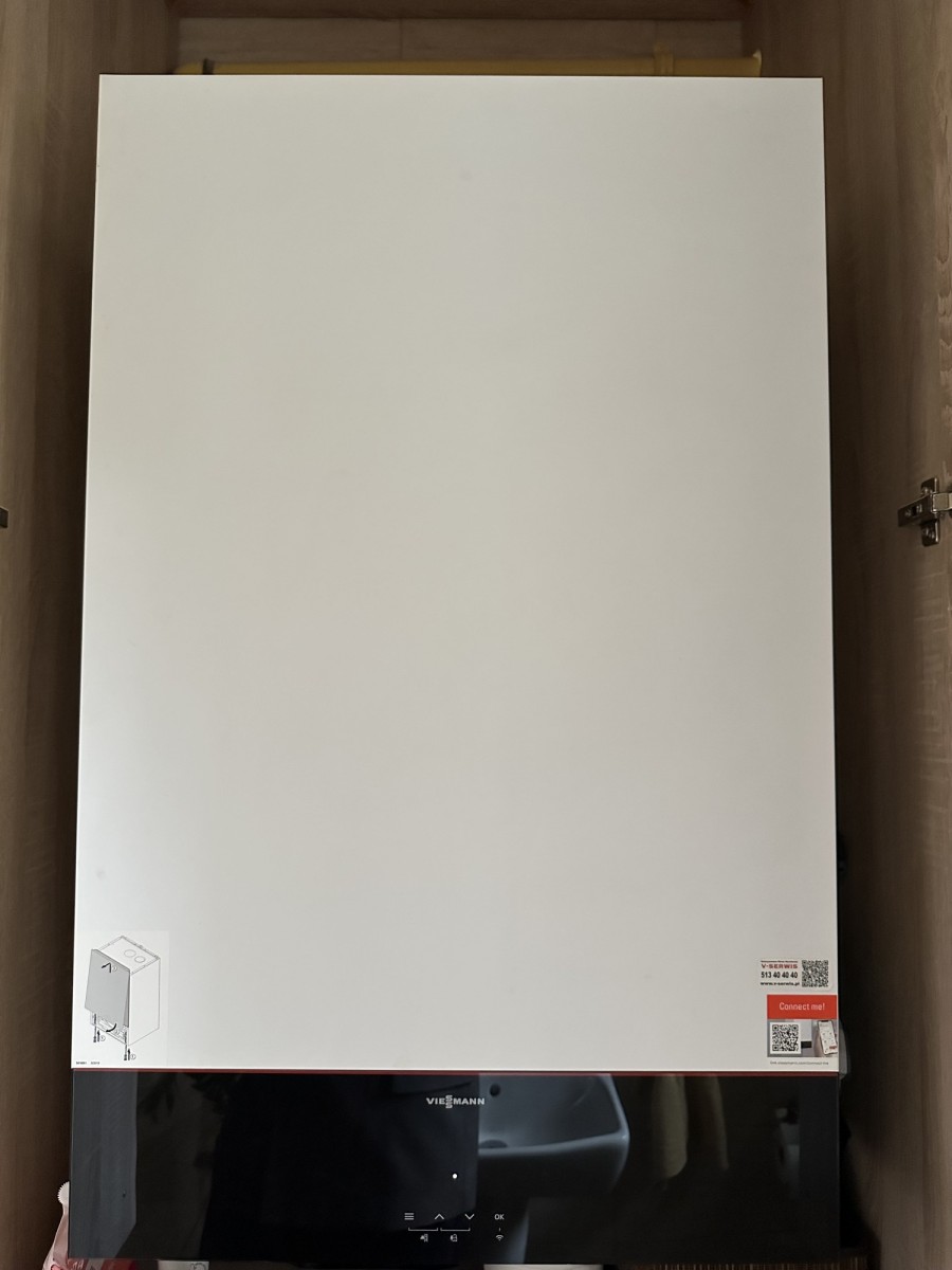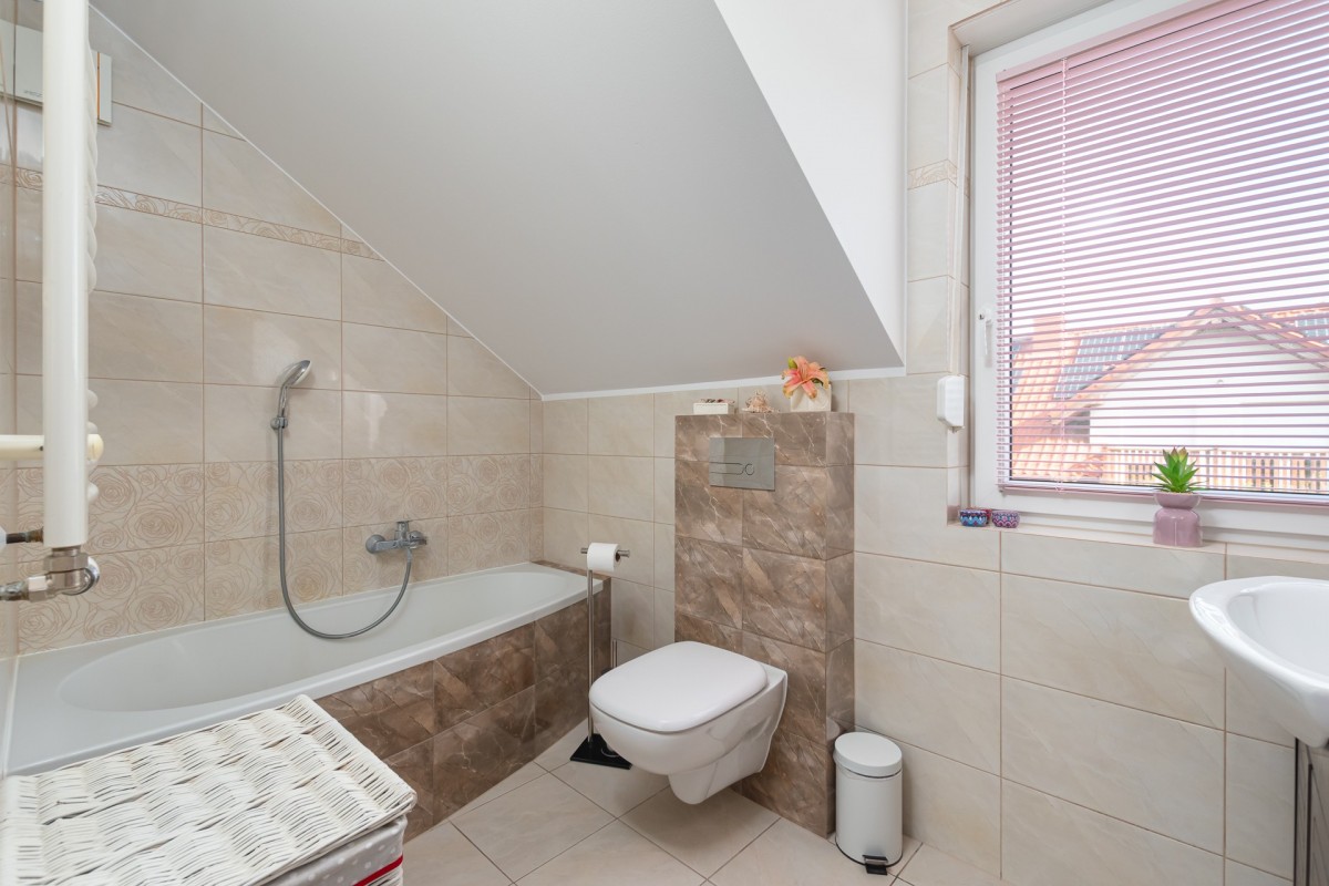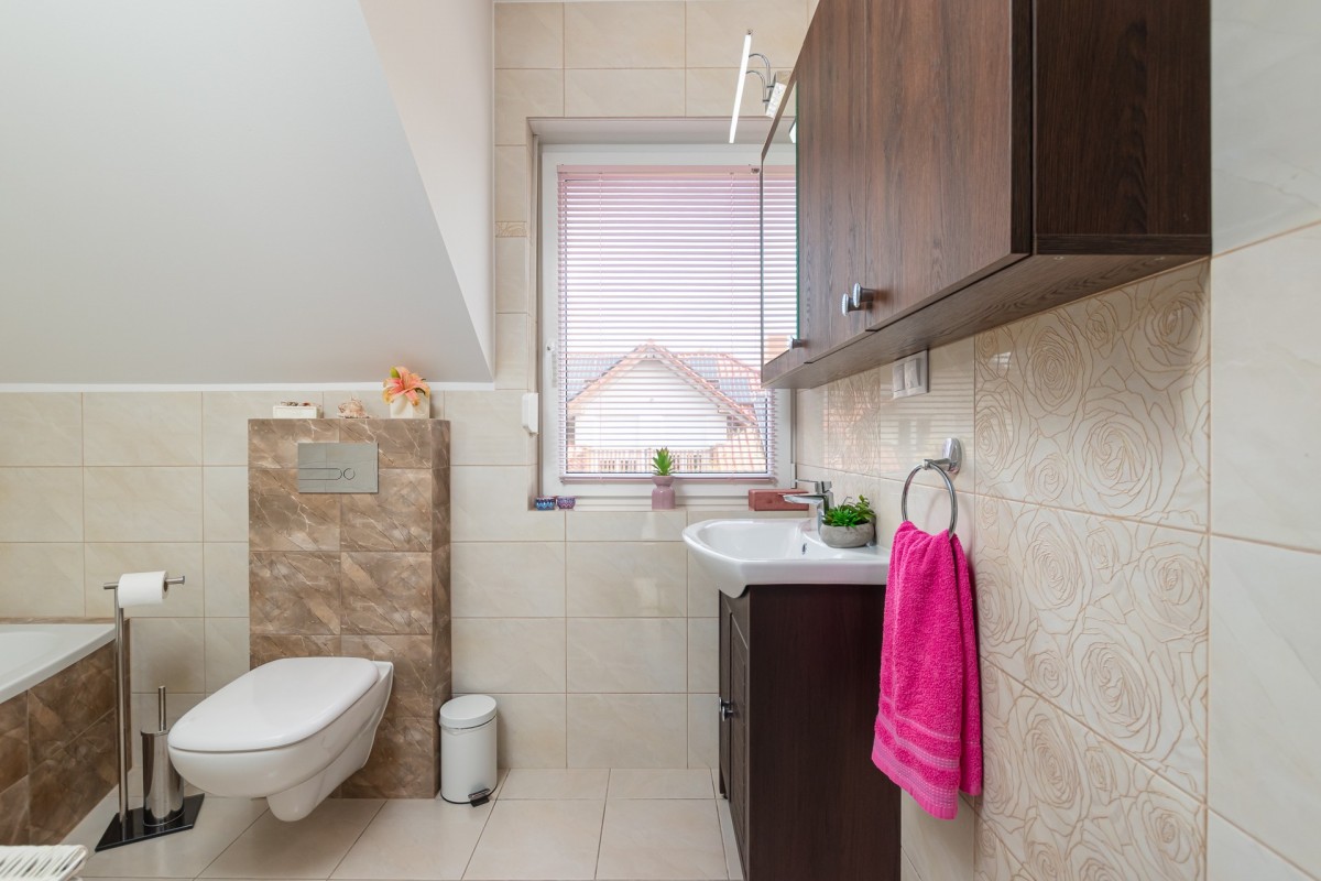 - łazienka z prysznicem i pralką, piec gazowy z zasobnikiem marki Viessmann został zabudowany szafką.