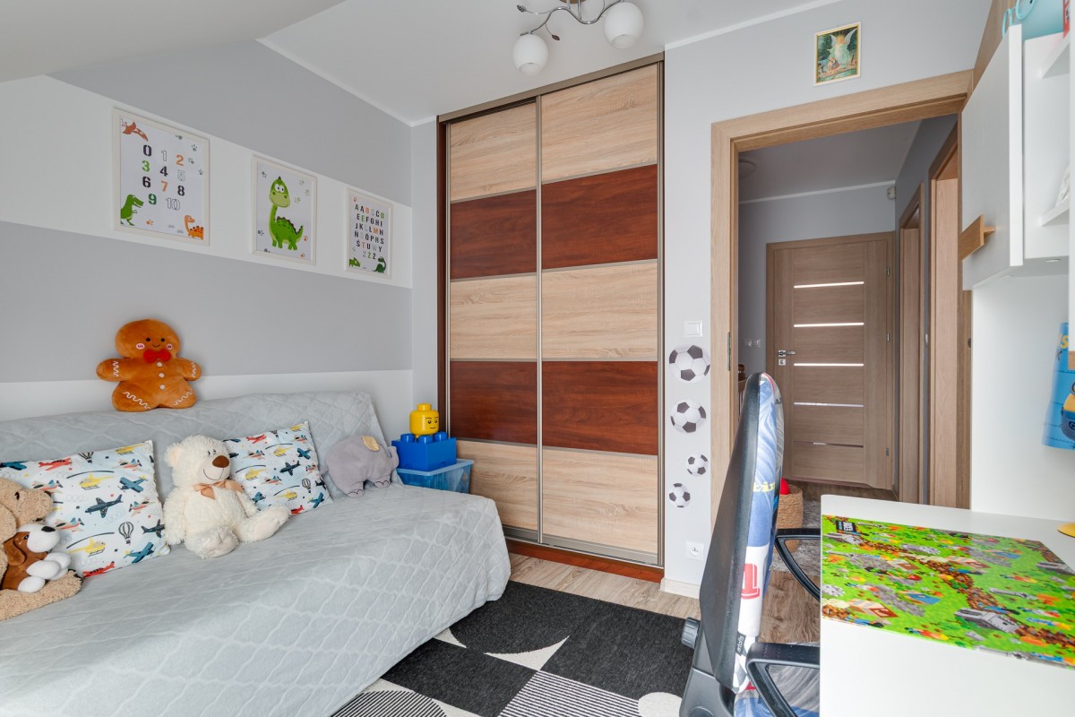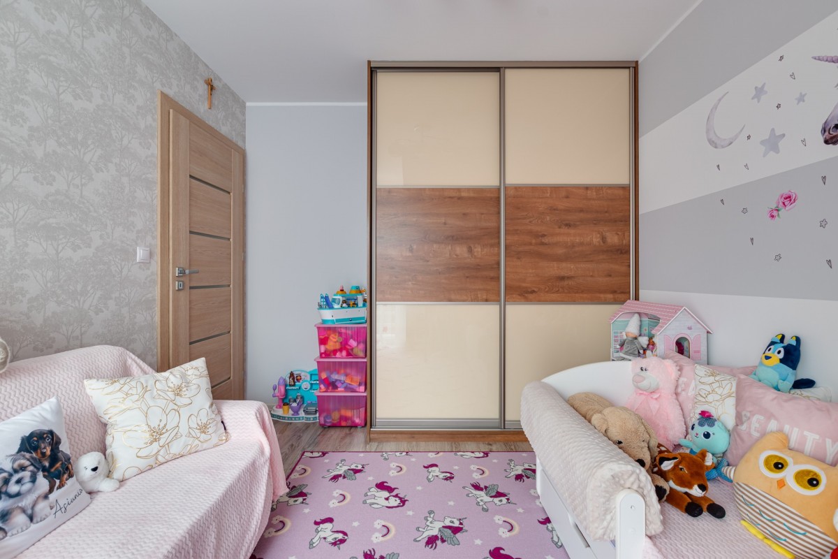 - 3 sypialnie: idealne rozwiązanie dla rodziny 2+2, z pokoi dziecięcych wyjście na balkon. W każdym pokoju oprócz łóżek znajdują się również pojemne szafy w zabudowie, na podlogach wysokogatunkowe panele.