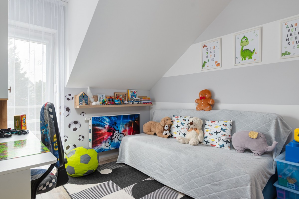 Wszystkie okna w domu zostały zabezpieczone moskitierami oraz objęte systemem rolet zewnętrznych. Dodatkowo przy wejściu do budynku znajduje się kamera, a poczucie bezpieczeństwa dodatkowo zwiększa dwustrefowy alarm.