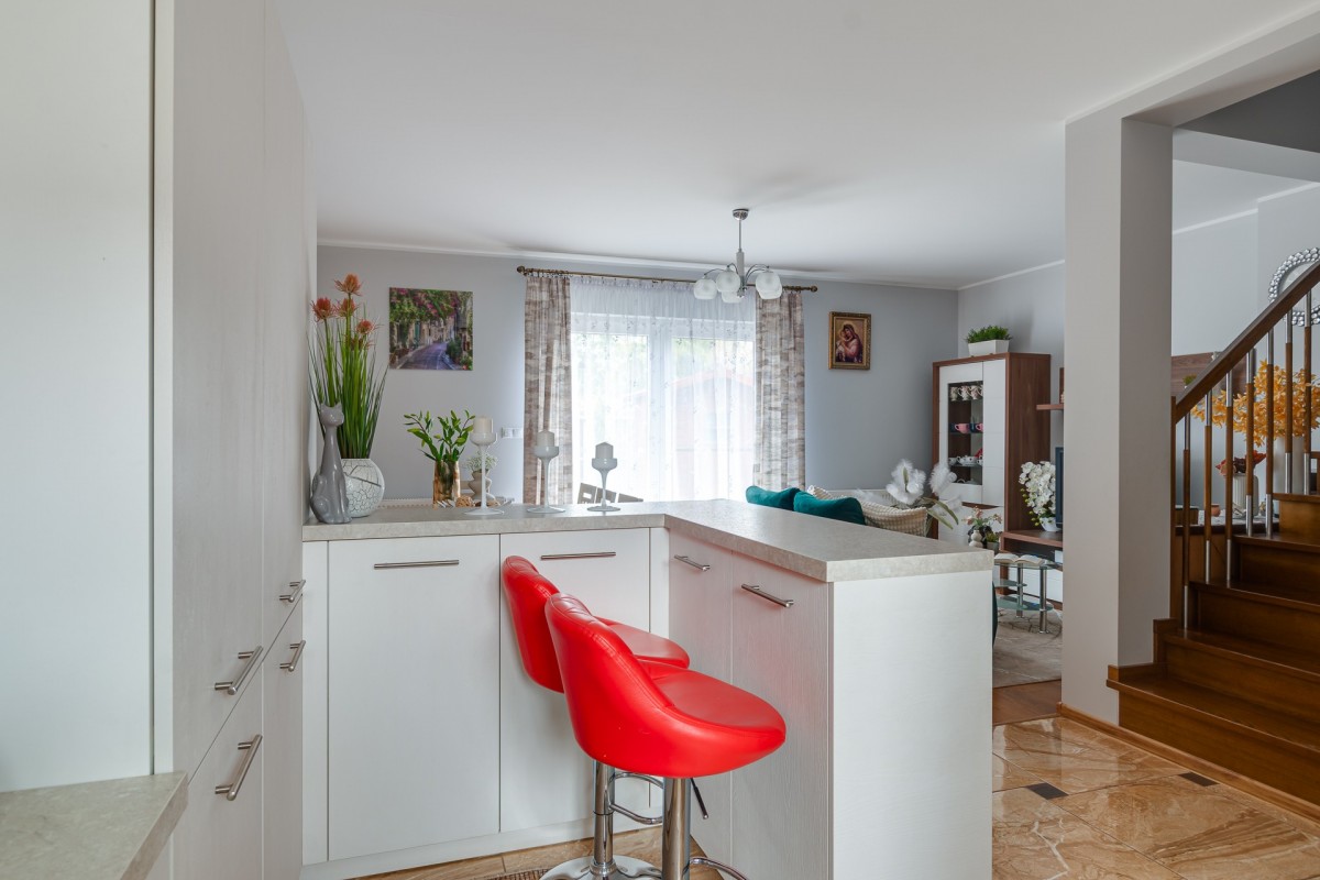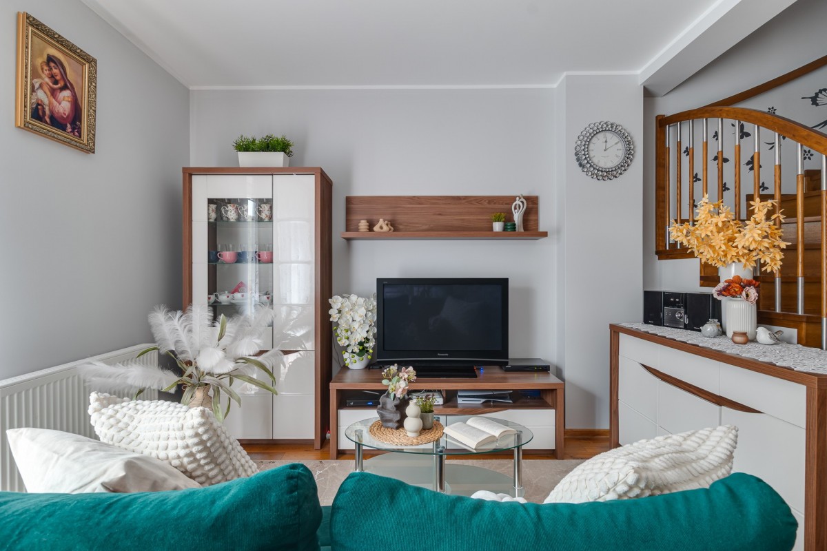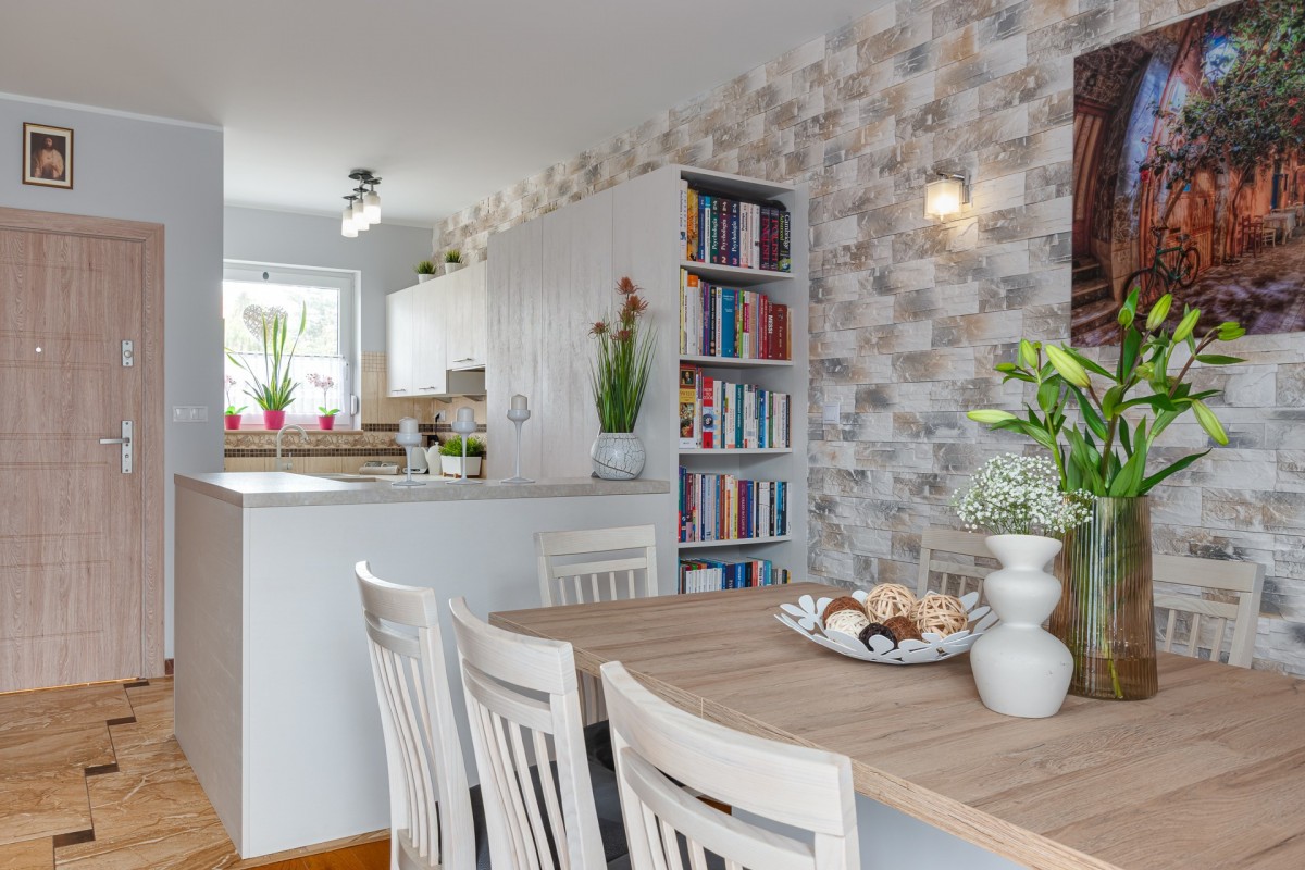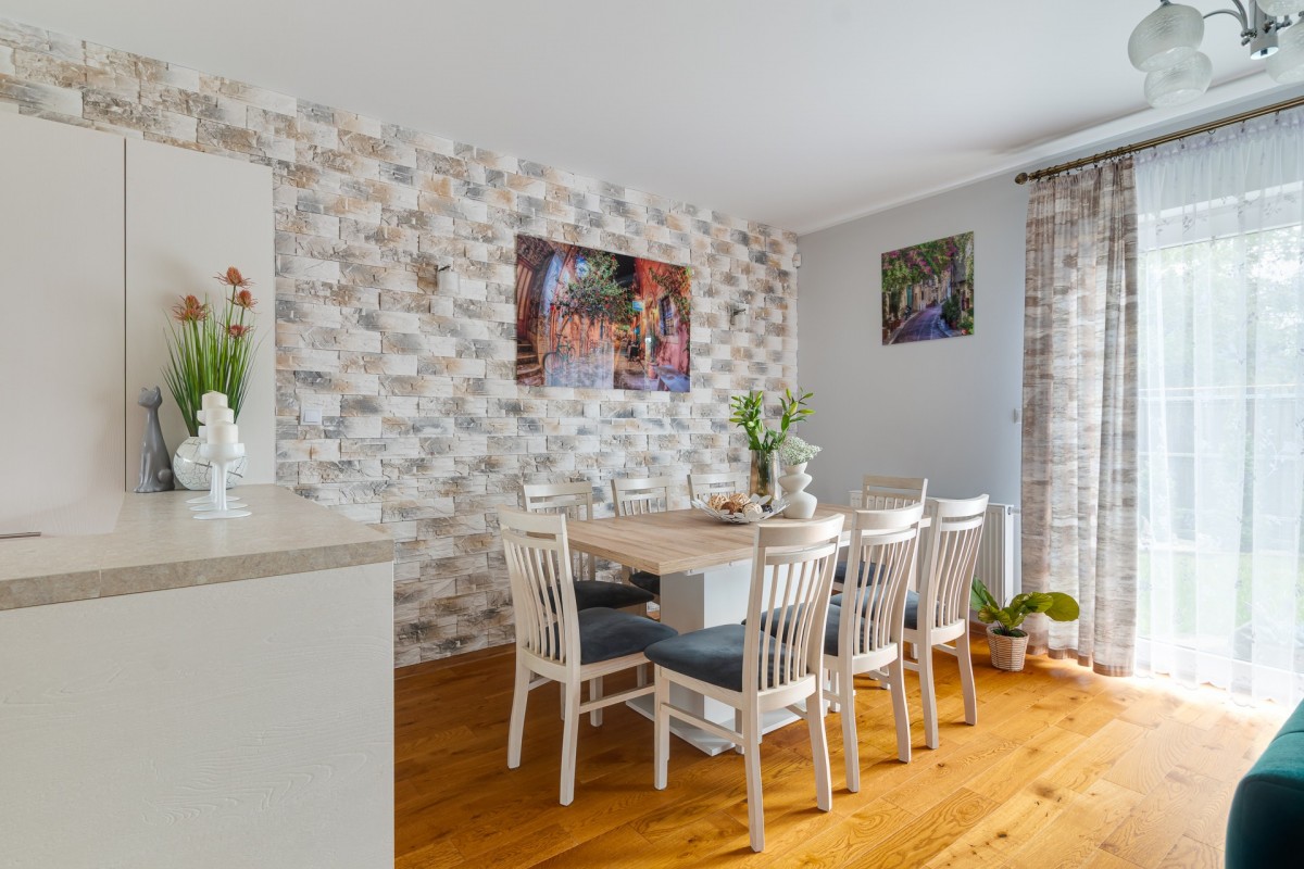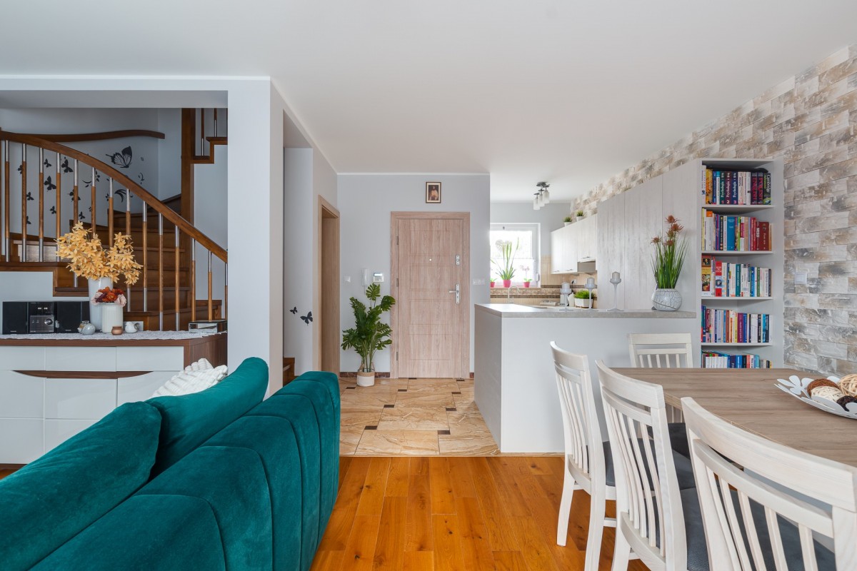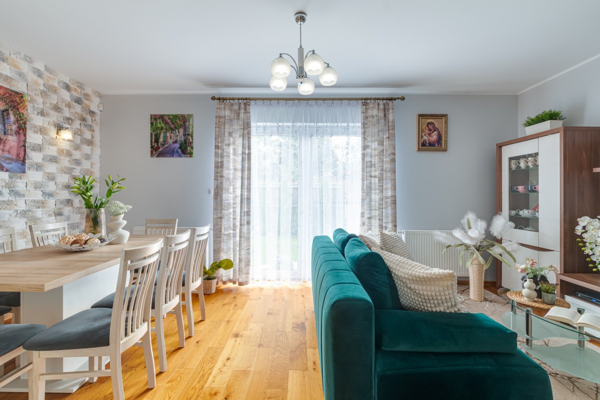 - salon z aneksem kuchennym: zabudowa stolarska renomowanej firmy Wolsztyńskie Meble Kuchenne, piekarnik, zmywarka 45 cm, plyta indukcyjna, okap oraz lodówka w zabudowie. W części jadalnianej znajduje się stół z 6 krzesłami, a w przytulnym salonie wygodna kanapa i kącik telewizyjny. Ciepły charakter wnętrza podkreśla doskonale utrzymana deska barlinecka. Z salonu wyjść można na niewielki, ale zadbany i przemyślany ogródek o powierzchni 30m2.