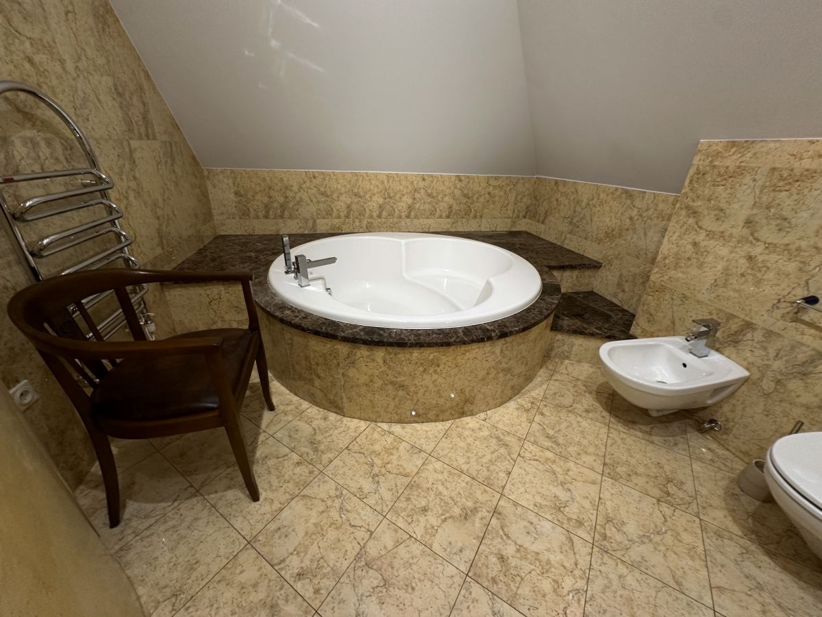 - Ванна кімната площею 32,60 м² з ванною, душем, двома раковинами та балконом площею 20,70 м²