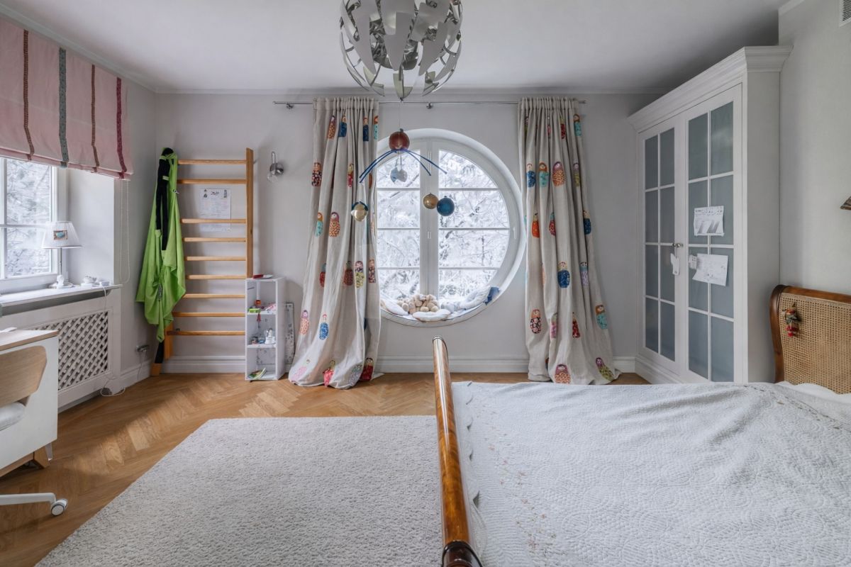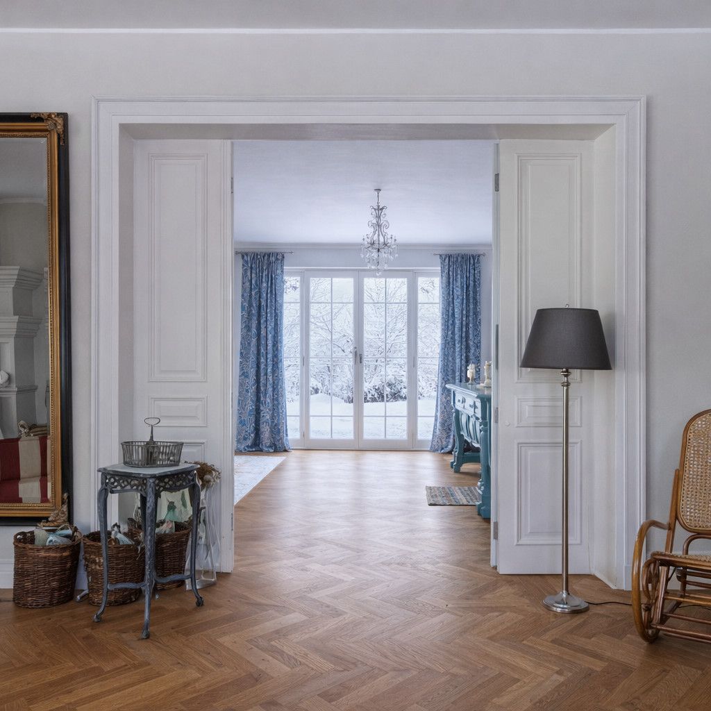 Na podłogach szlachetna klepka dębowa - pastelowe kolory jak i klasyczne drewniane, bielone okna ze szprosami.