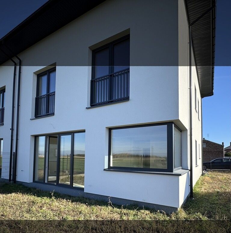Modern semi-detached house with a large garden (200 m²), finished in bright, pleasant tones. Functional layout with a garage integrated into the building structure.